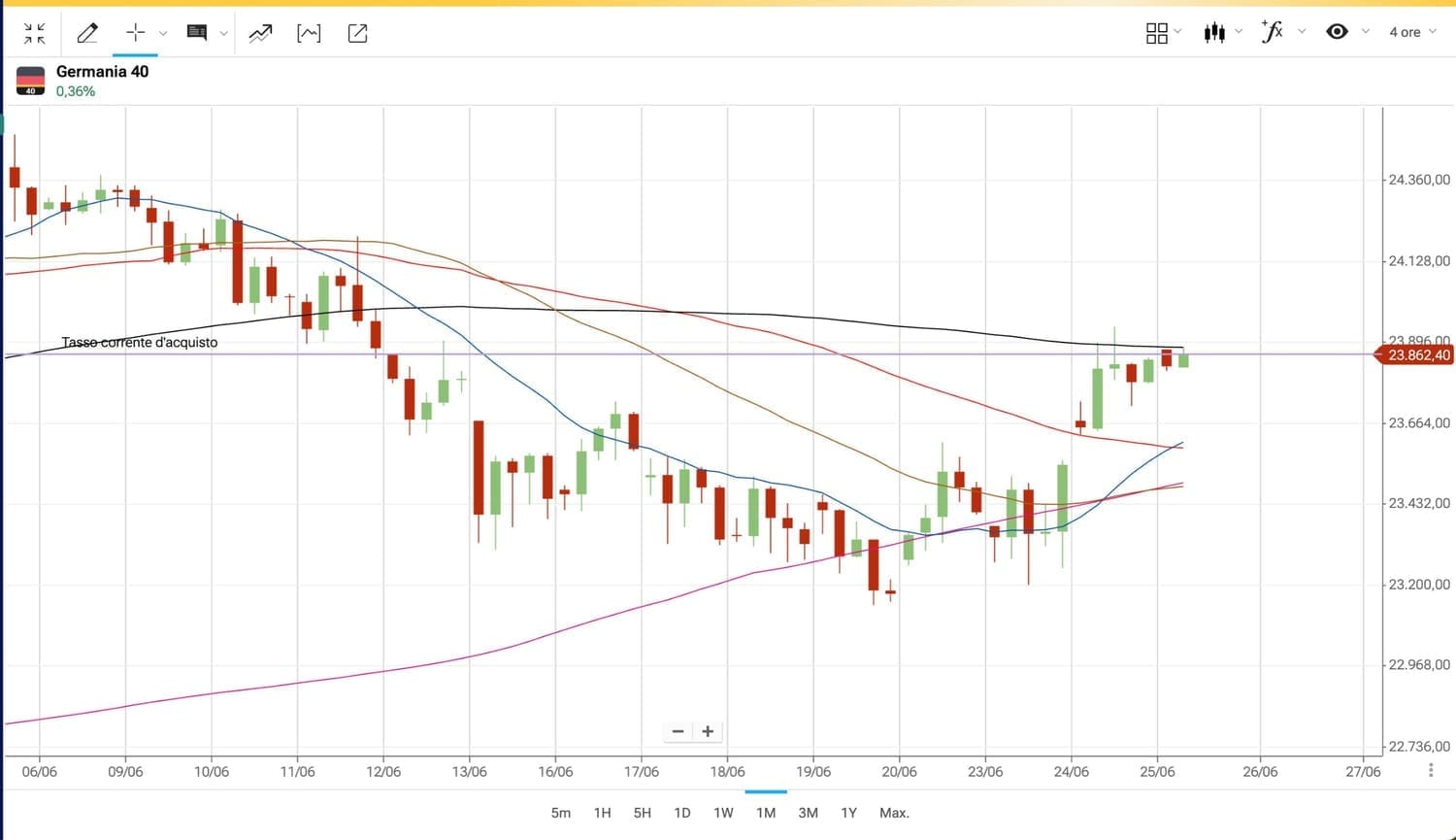 Nell’ultimo periodo ci saremmo aspettati una discesa e questa si è verificata, con il MIB che è passato dai 40700 punti del 8 Giugno ai 38700 punti del 23 Giugno (2000 punti), mentre il DAX è sceso di 1400 punti, dai 24550 a 23150 circa.