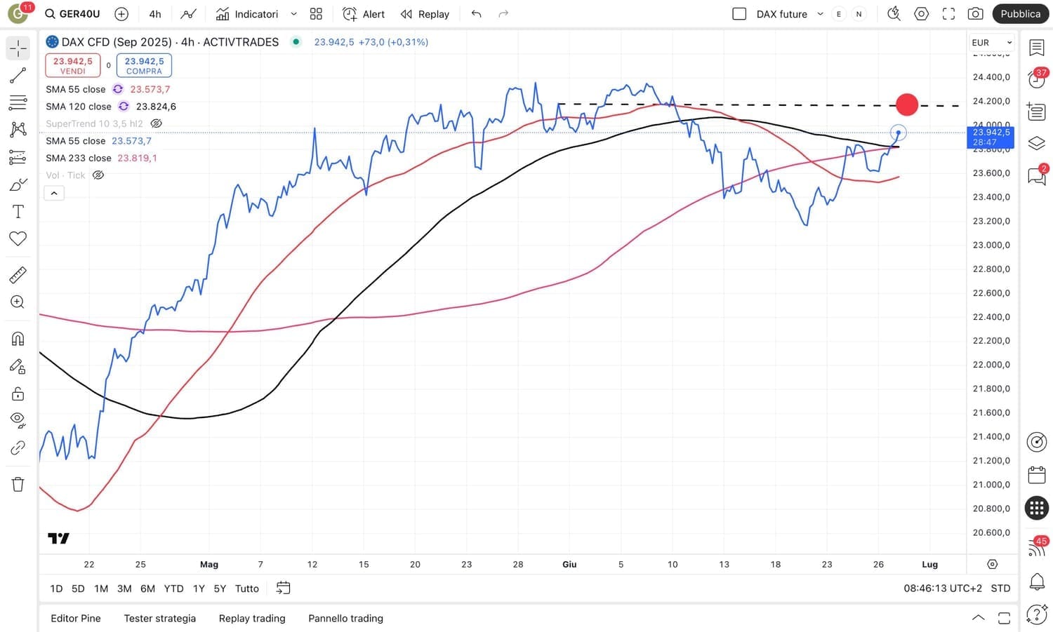 Sul DAX future la RESISTENZA più visibile è quella del grafico a 4 ore contro la MEDIA MOBILE nera a 120 periodi.