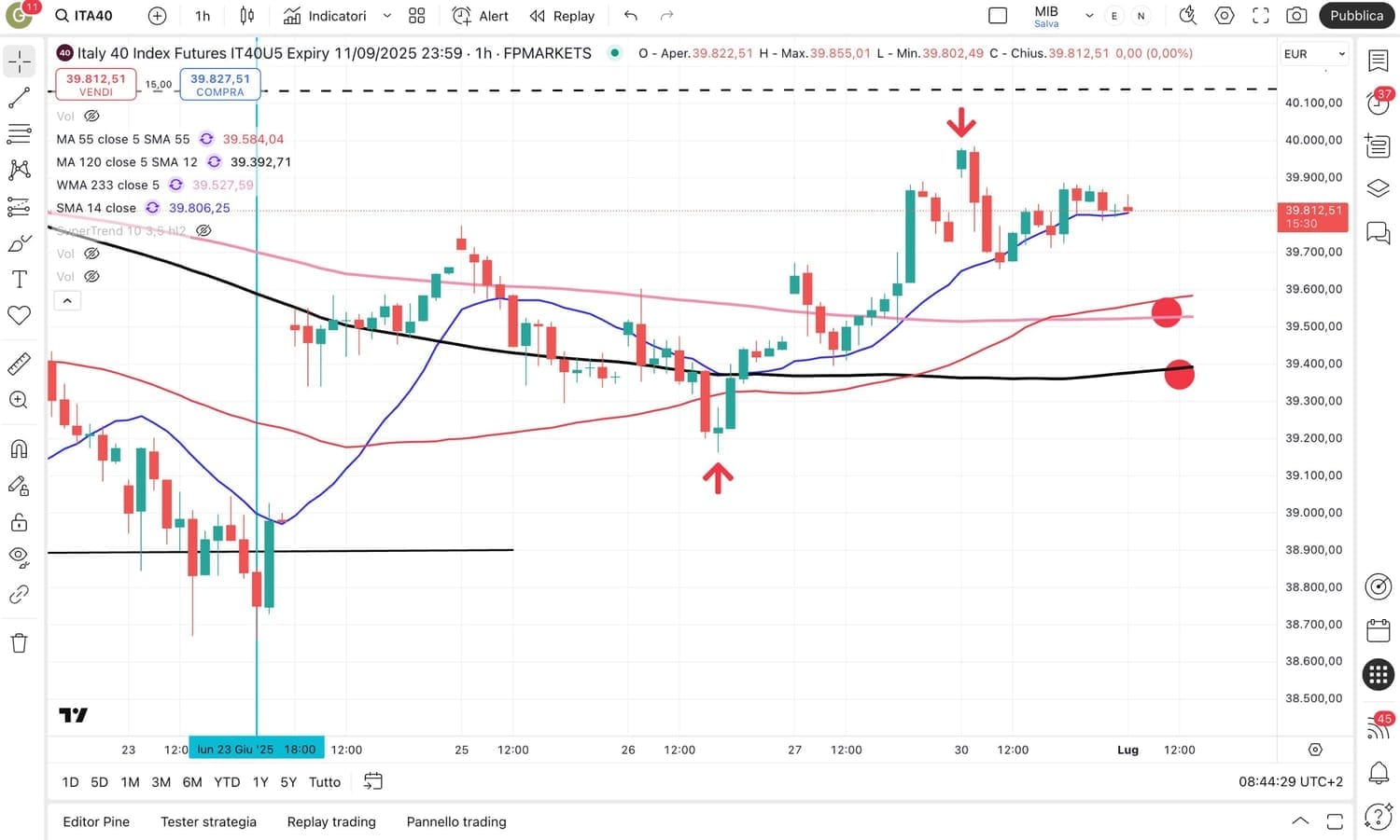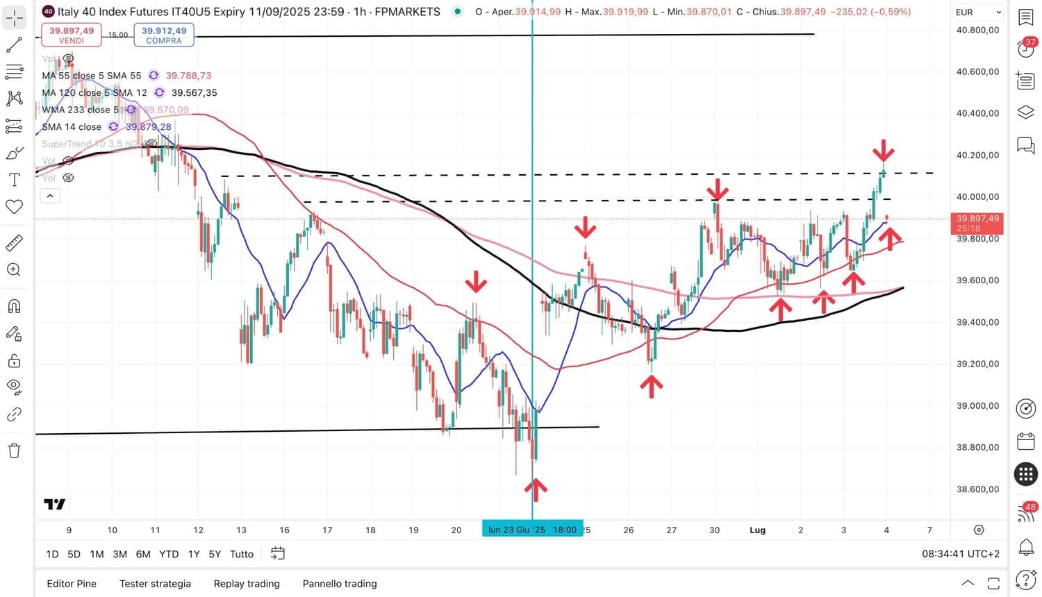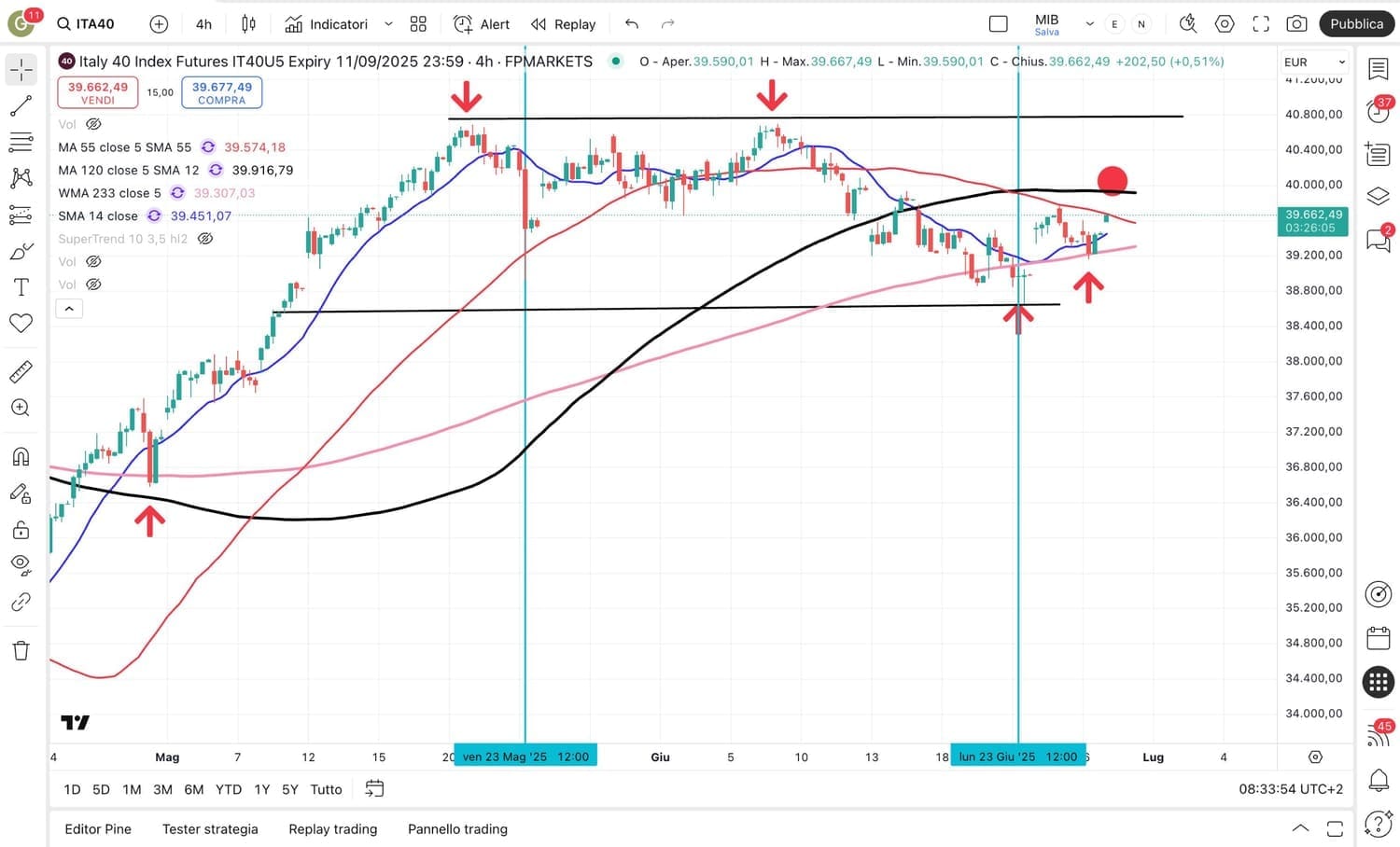Ci troviamo in prossimità della MEDIA MOBILE nera a 120 periodi, che potrebbe fungere da temporanea resistenza, mentre un po’ più in alto ci sarebbero i 40150-40200 punti, dove è stato fatto l’ultimo minimo del 10 Giugno poi bucato al ribasso.