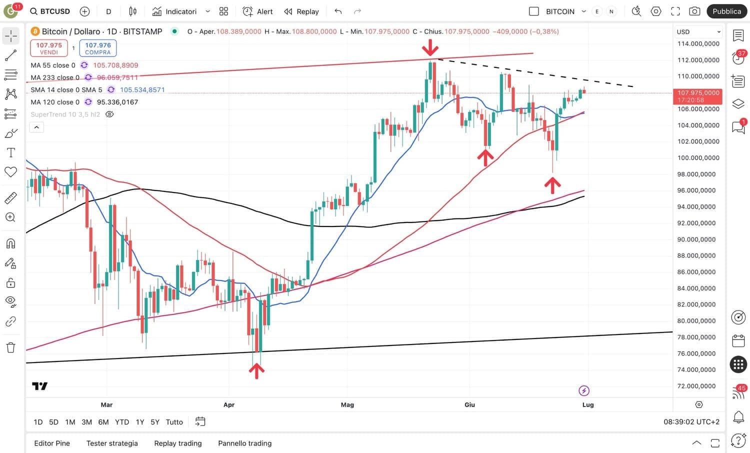 Partiamo stamattina dal BITCOIN, che dopo aver toccato ieri i 108500 dollari (facendo scattare l’ingresso della QUARTA QUOTA SHORT) è tornato sotto i 107000 dollari.