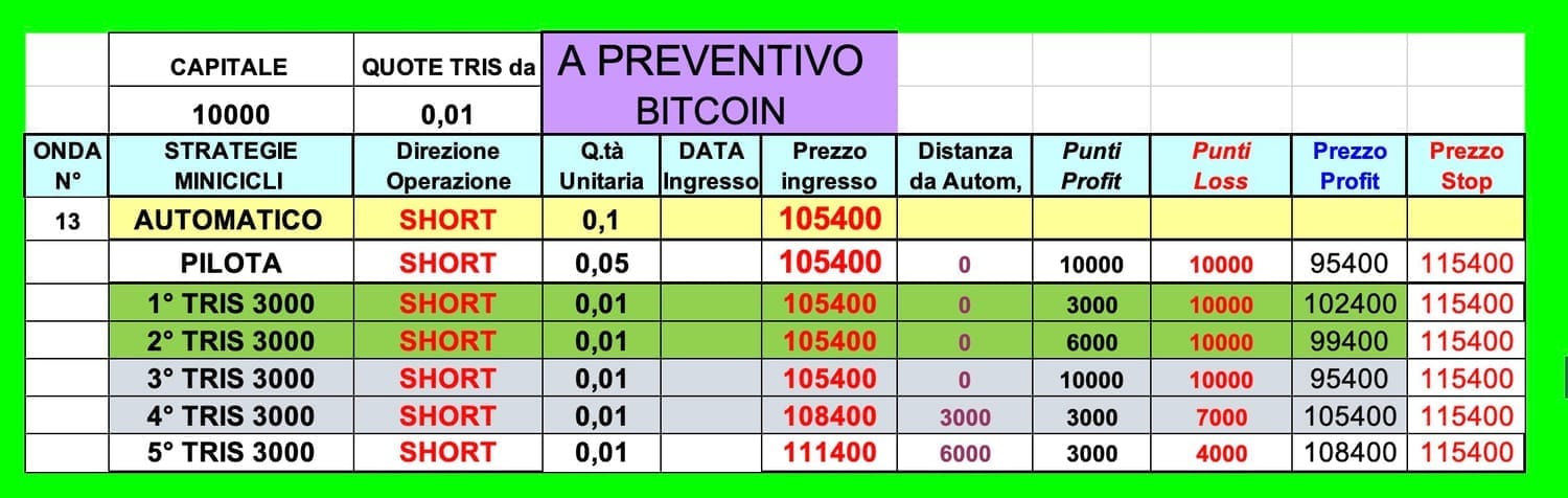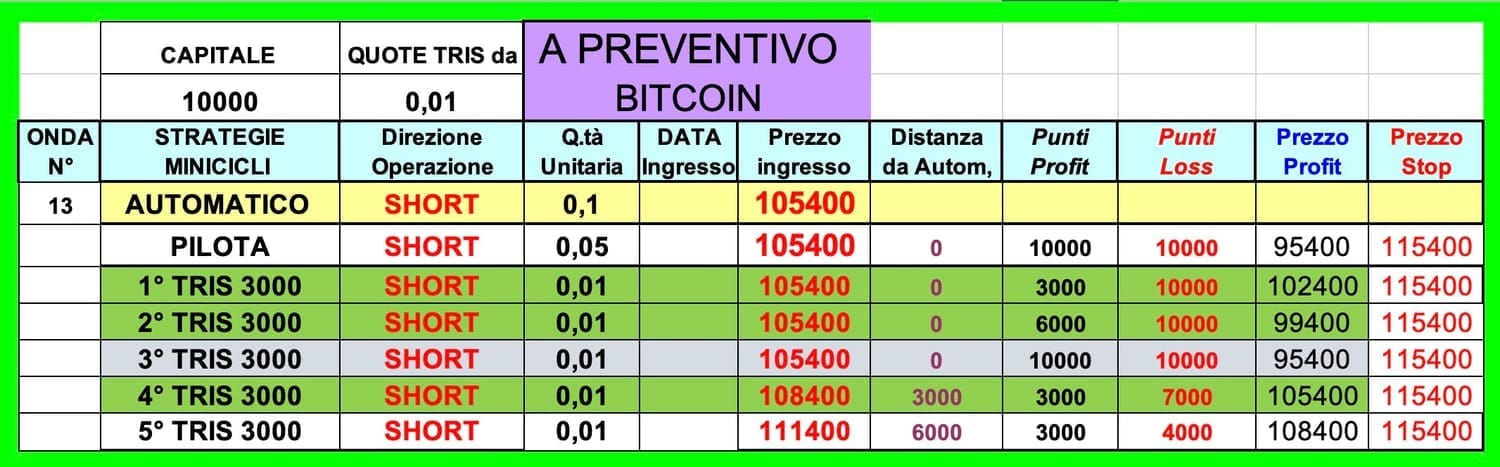 Nell’ottica delle STRATEGIE MINICICLI, dal dato iniziale di riferimento al RIBASSO a 105400 dollari, erano già scattati due take profit, da 105400 a 102400 (+3000 punti/dollari) e da 105400 a 99400 dollari (+6000 punti/ dollari).