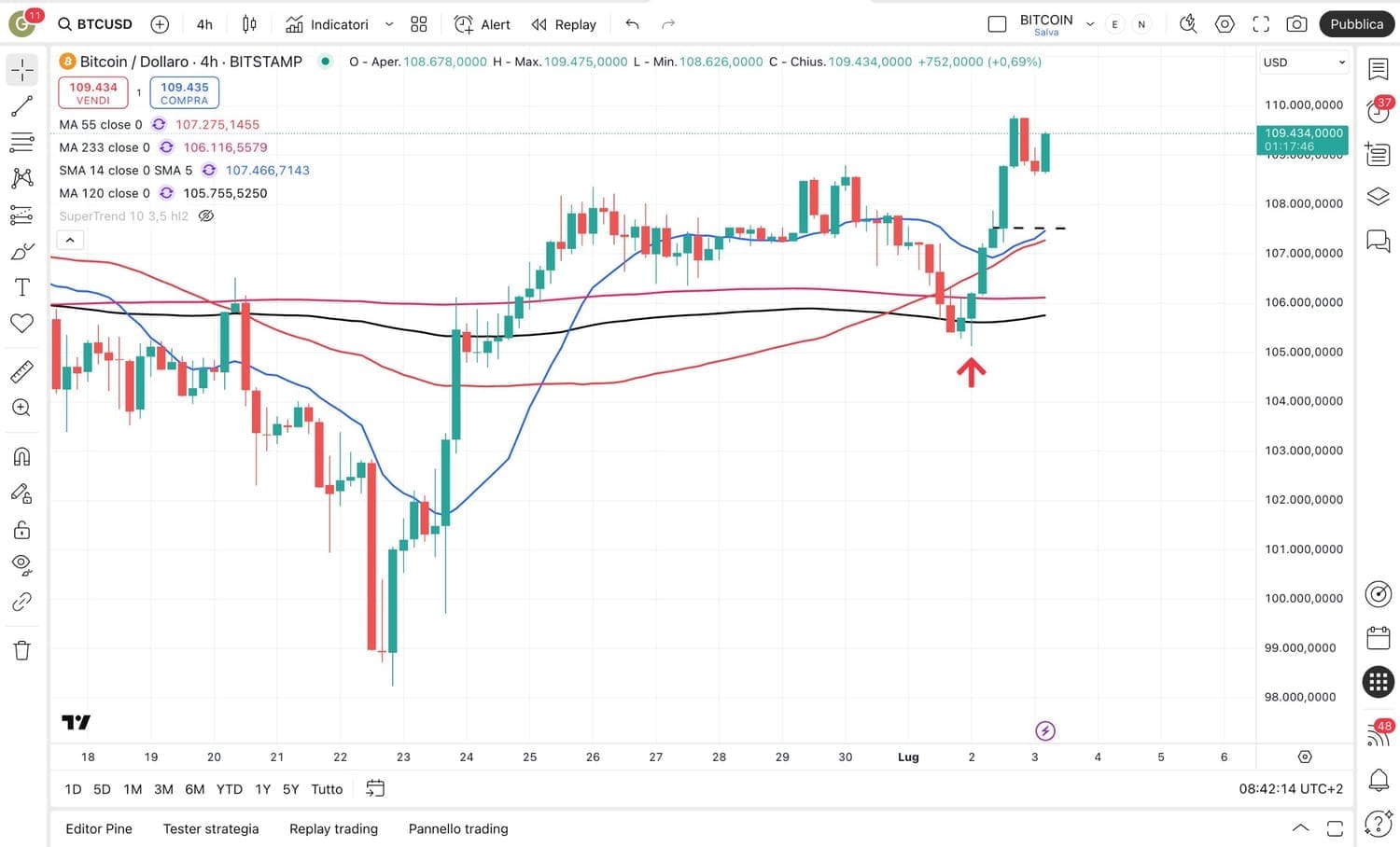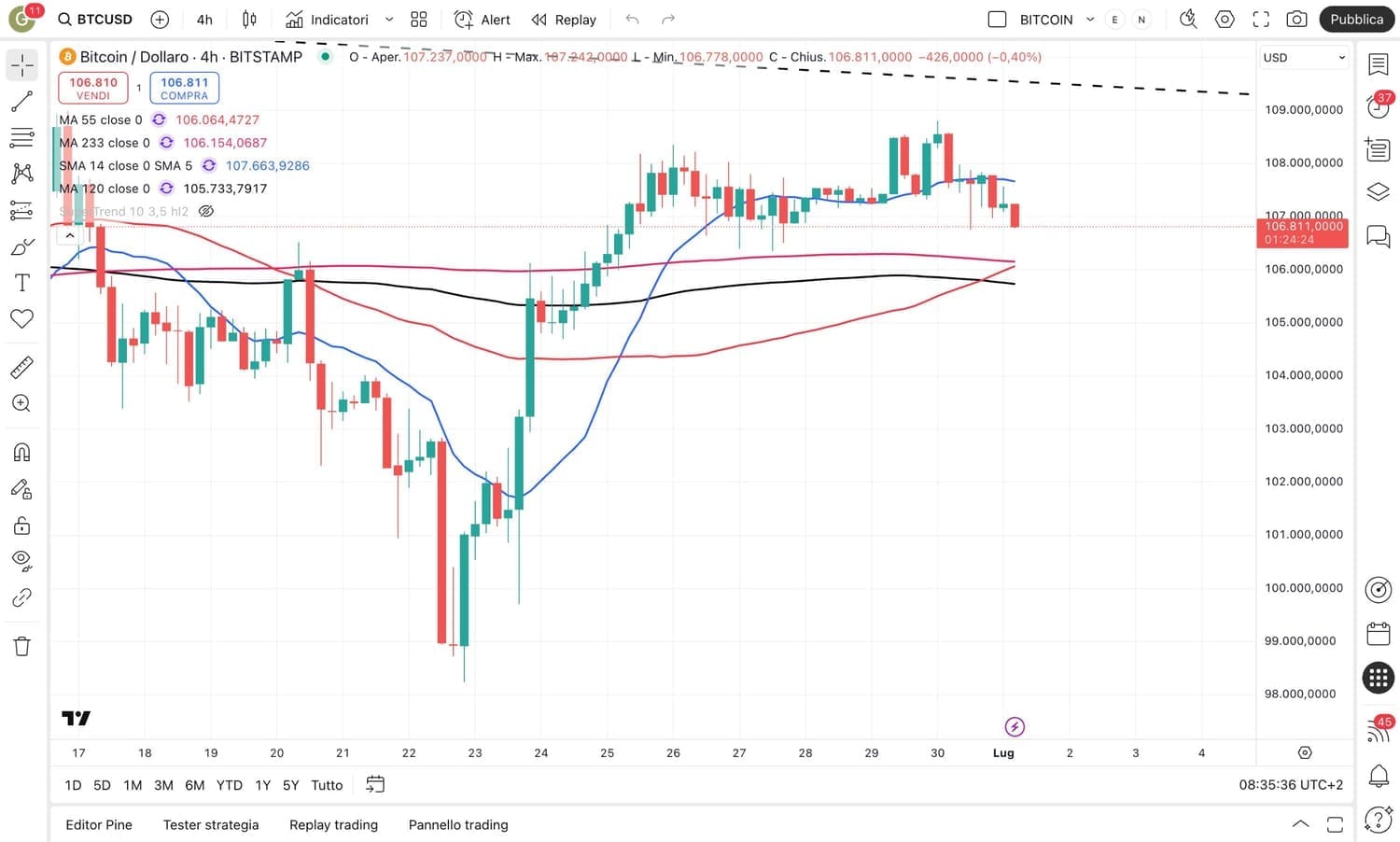 Il prezzo di BITCOIN è tornato attualmente sopra i 108000 dollari, dopo una fase di oscillazioni limitate tra i 106000 e i 107000 dollari circa.