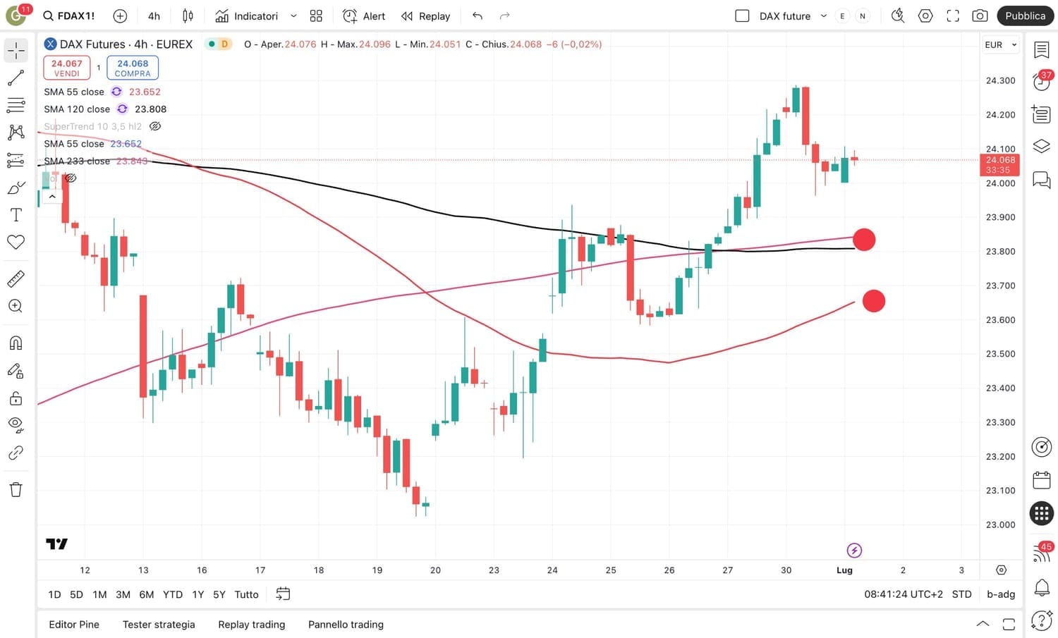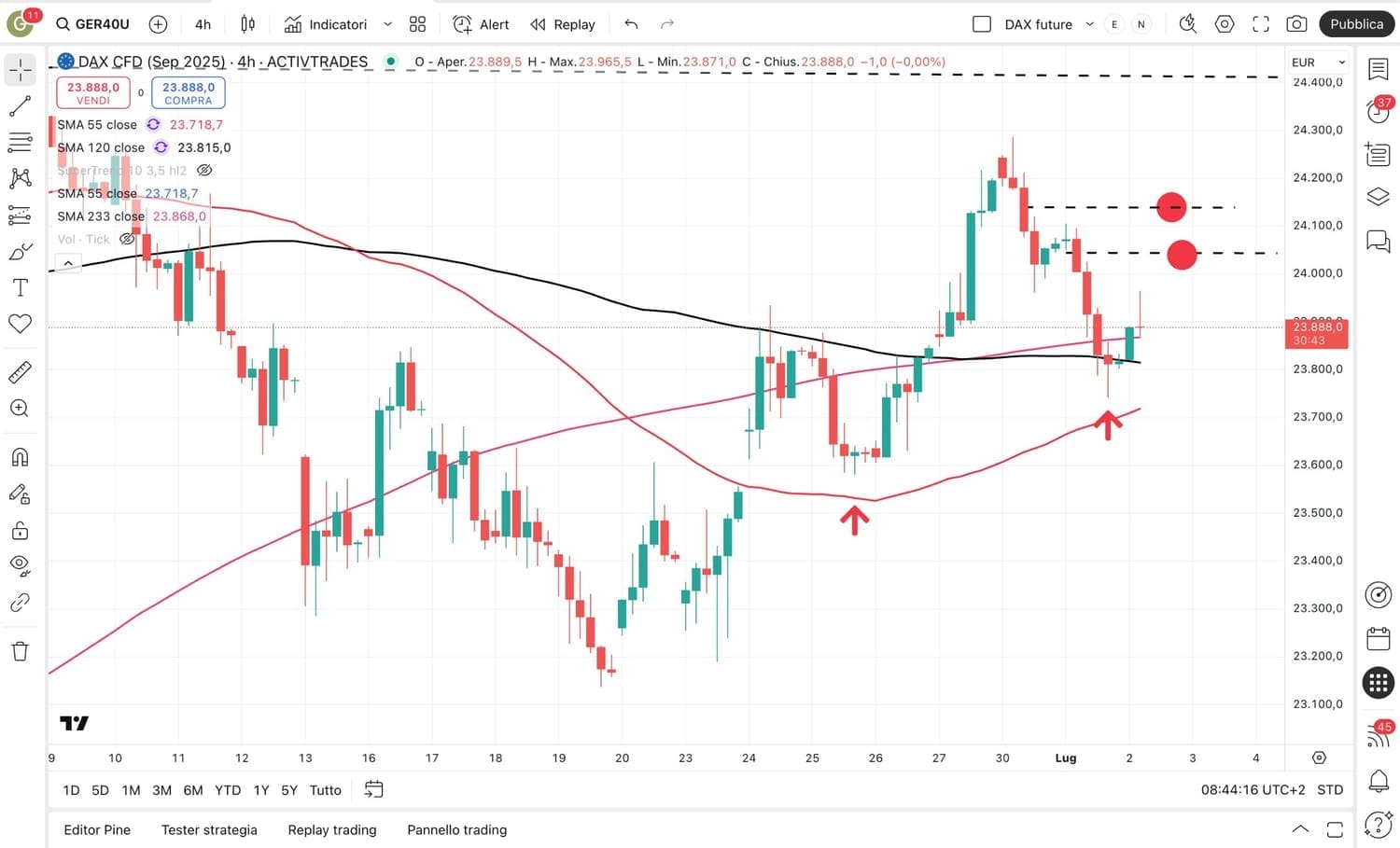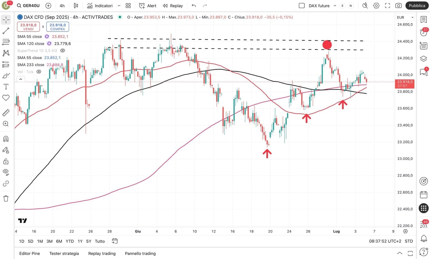 Stiamo comunque registrando minimi e massimi leggermente crescenti dal MINIMO di periodo del 23 Giugno, quando il MIB raggiunse i 38700 punti, mentre il DAX arrivò a 23150 punti circa.