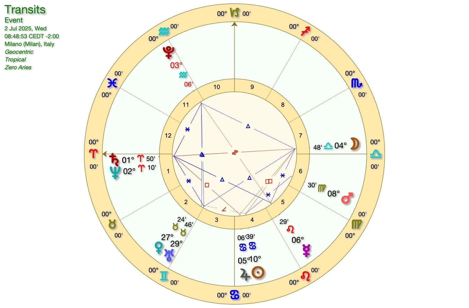 Notiamo anche MERCURIO che è entrato in LEONE, in OPPOSIZIONE a PLUTONE in ACQUARIO.