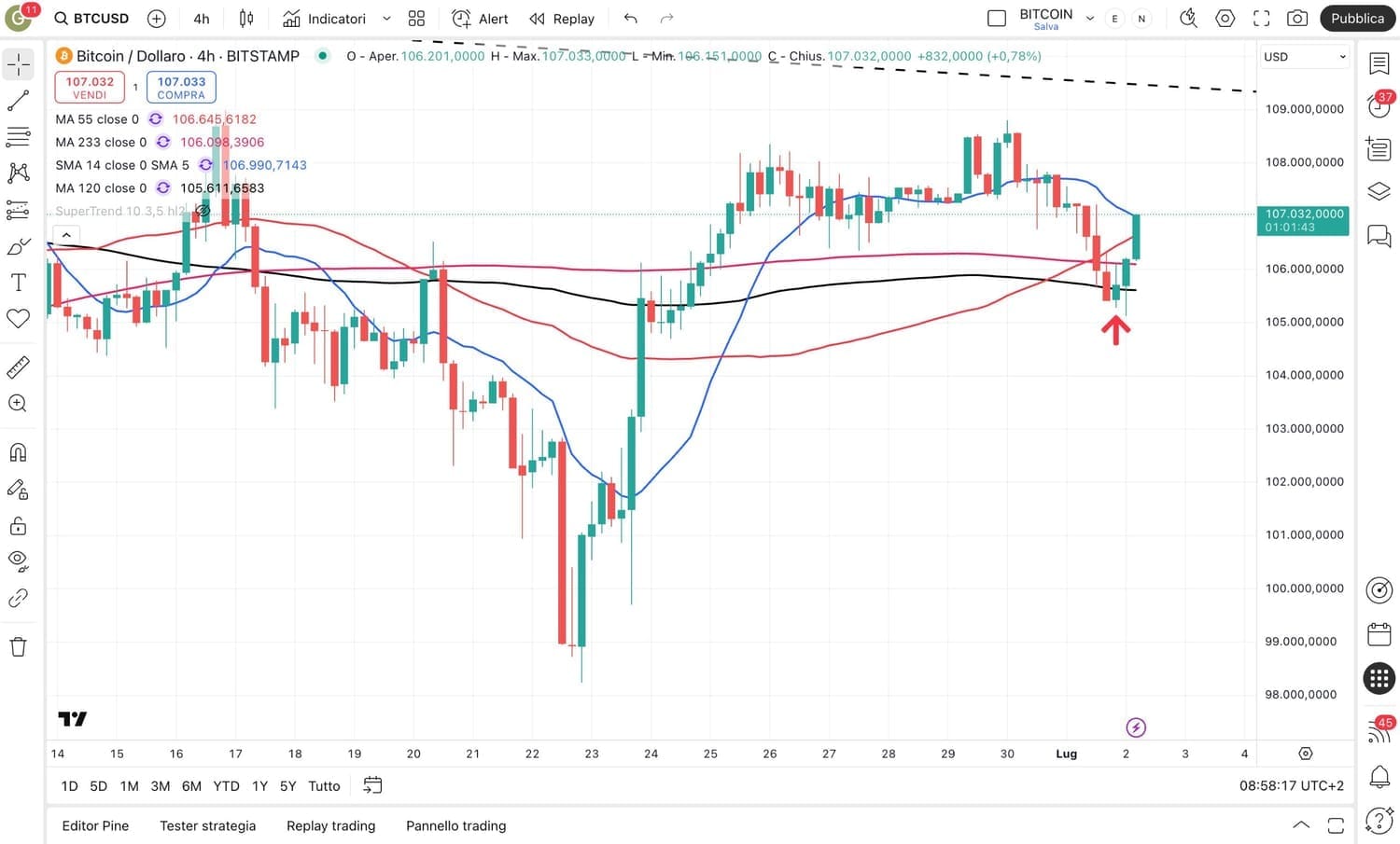 La stessa cosa si è verificata su BITCOIN, che proprio il giorno 1° Luglio era tornato poco sopra i 105000 dollari, che erano stati il punto di partenza dell’ONDA al RIBASSO.