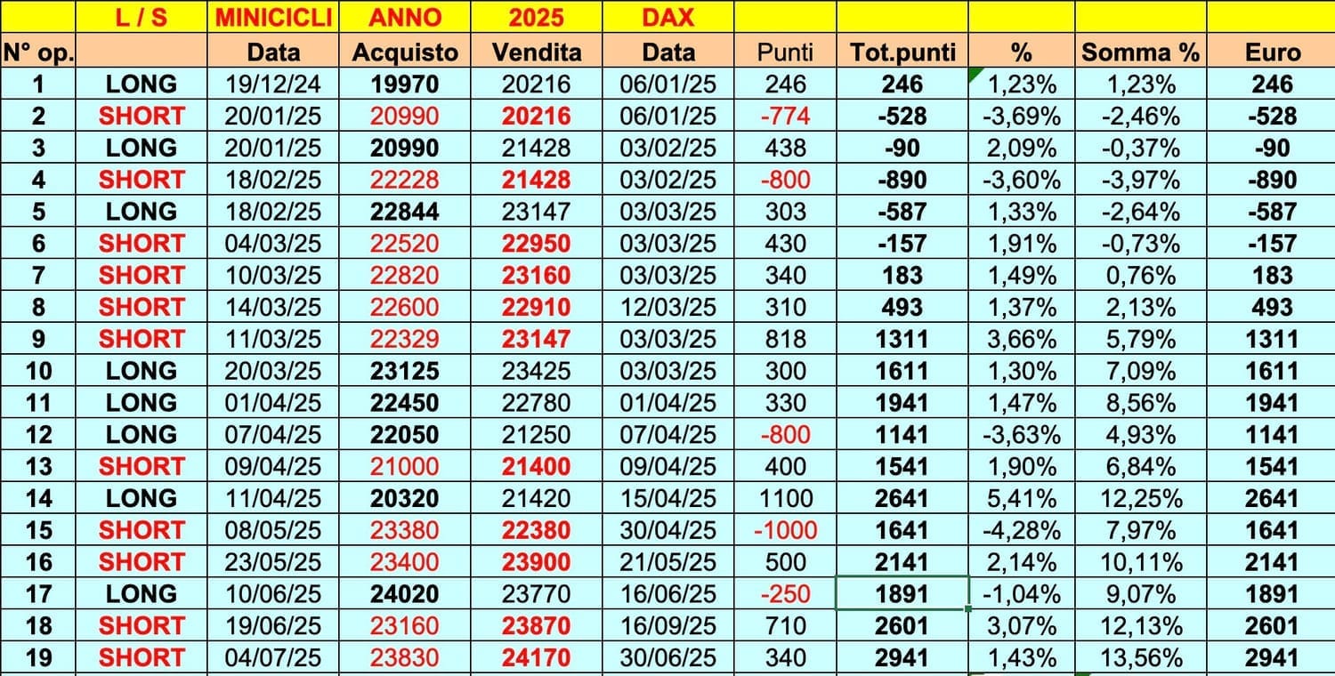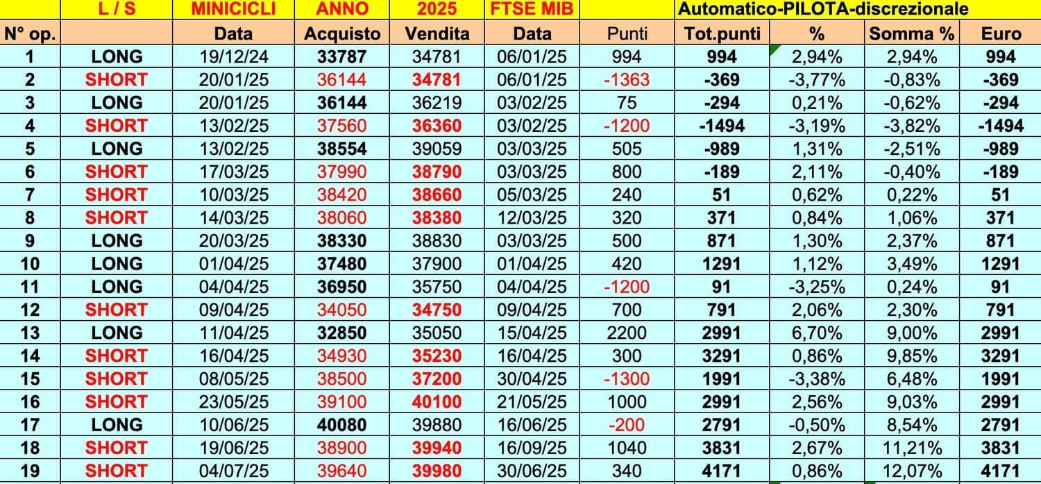 Bene, credo di avervi fornito una panoramica realistica dell’andamento del primo SEMESTRE 2025, con i +4000 punti del MIB, i +3000 del DAX e i +30000 punti /dollari di BITCOIN, in un percorso tutt’altro che facile e lineare e che sicuramente ha messo a dura prova gli “OPERATORI”.