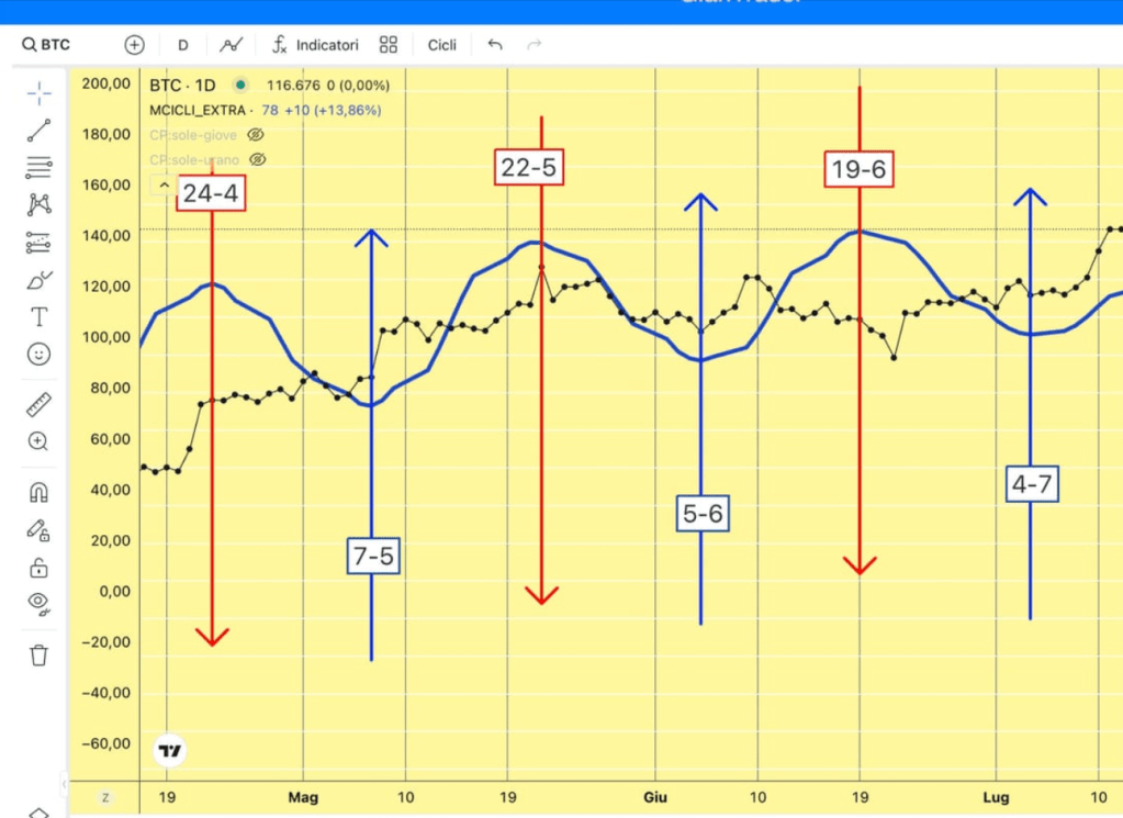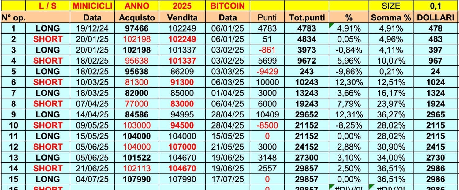 Su BITCOIN abbiamo un “MIX” di dati in “automatico” (cioè il dato di fine giornata quando cambia l’ONDA) e di applicazione delle STRATEGIE.