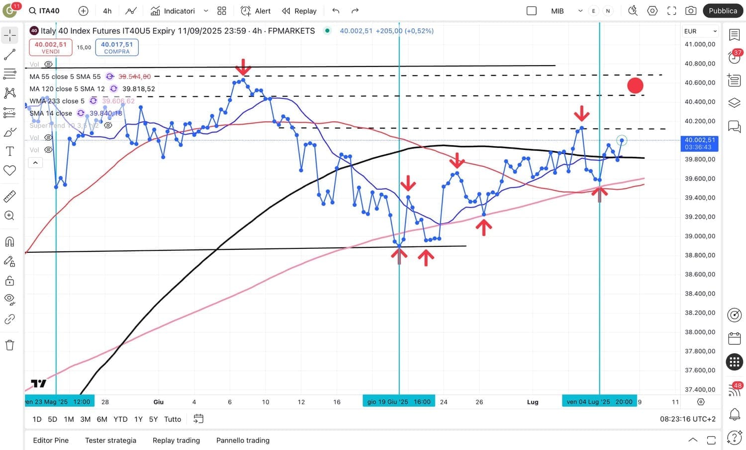 Dai due MINIMI ravvicinati del 19 e 23 Giugno attorno ai 38700 punti osserviamo una STRUTTURA rialzista, con MINIMI e MASSIMI crescenti.