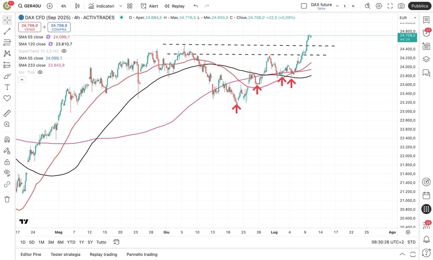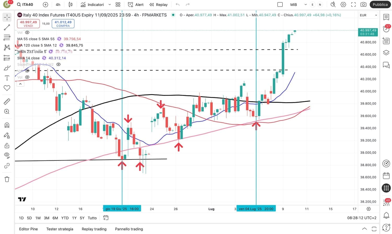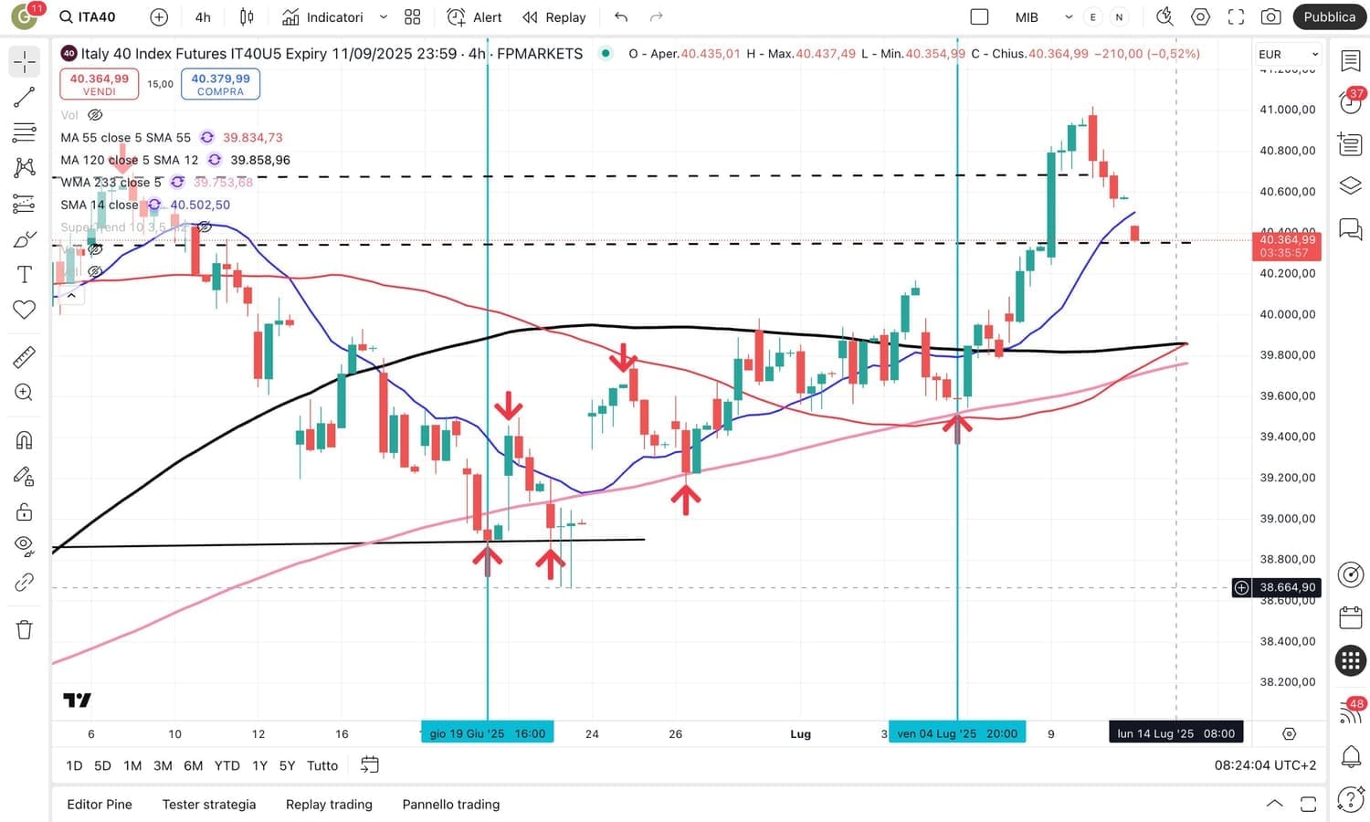 Passiamo ora agli INDICI MIB e DAX, che avevano già completato il programma delle STRATEGIE al RIALZO (il MIB era salito oltre 1000 punti dal MINIMO del 4 Luglio attorno ai 39600 arrivando persino alla soglia dei 41000 punti).
