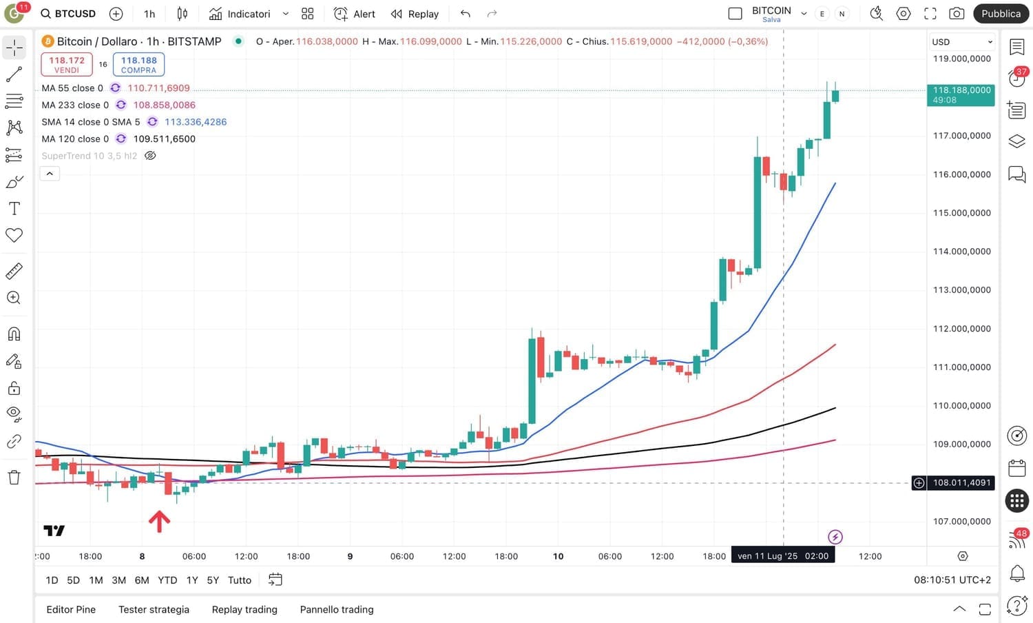 Stiamo assistendo ad un incredibile impulso rialzista sul BITCOIN, che ha superato i 118000 dollari.