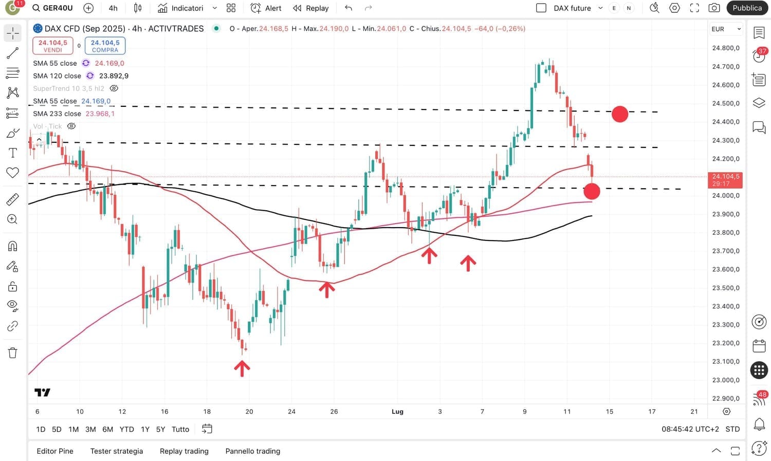 Il DAX sta tornando sulla soglia dei 24000 punti dopo il massimo di Martedì scorso attorno ai 24750 punti.