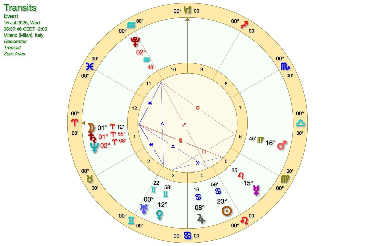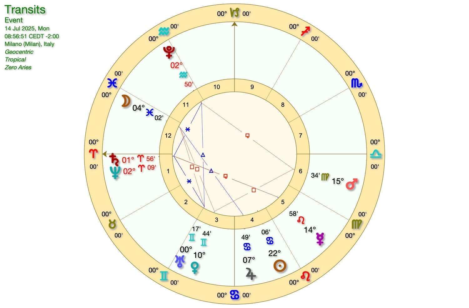 In particolare la LUNA è in QUADRATURA a URANO e VENERE in GEMELLI ma in TRIGONO a GIOVE e poi al SOLE in CANCRO.
