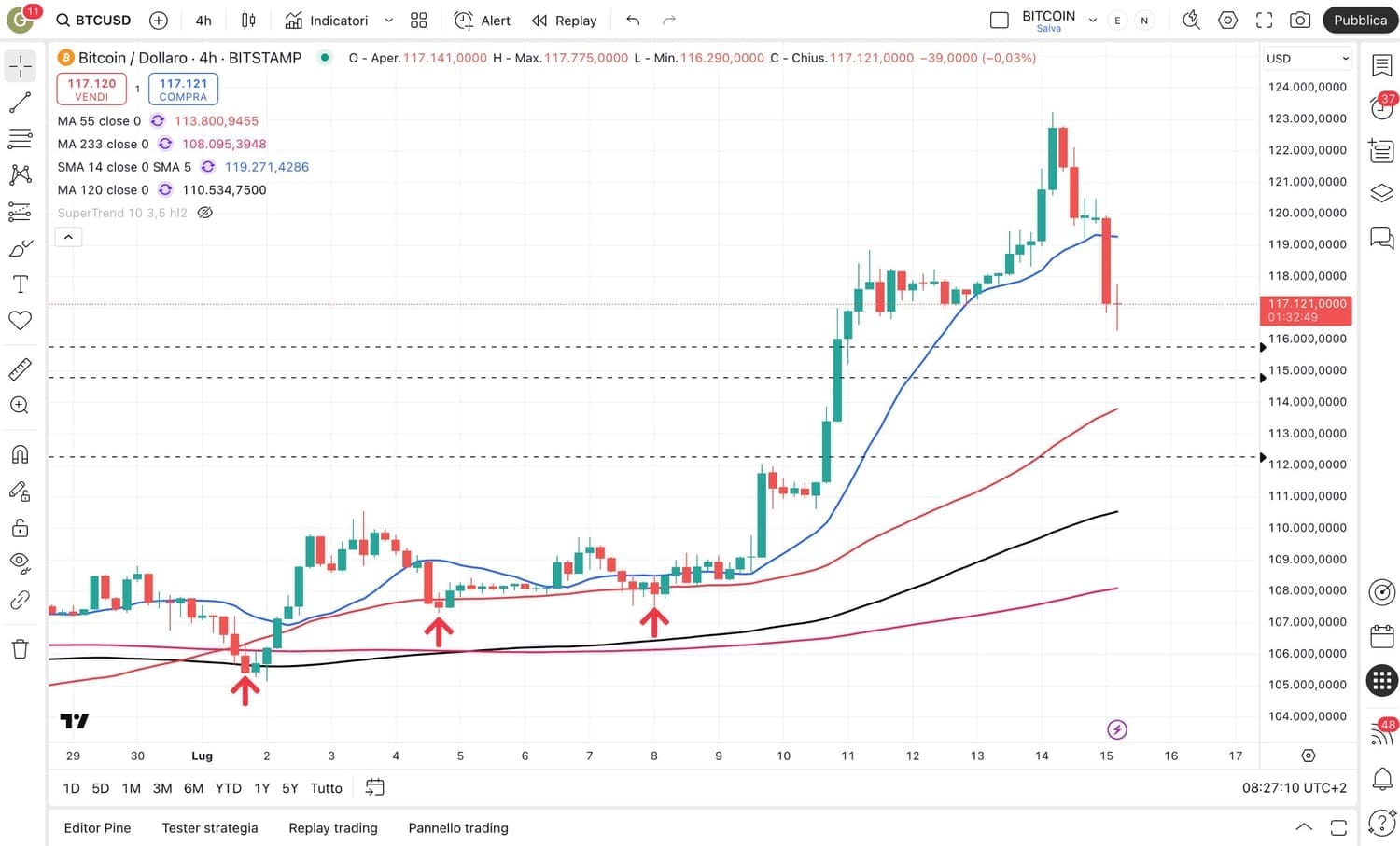 Questo intanto il grafico a 4 ore di BITCOIN, ora poco sopra i 117000 dollari.