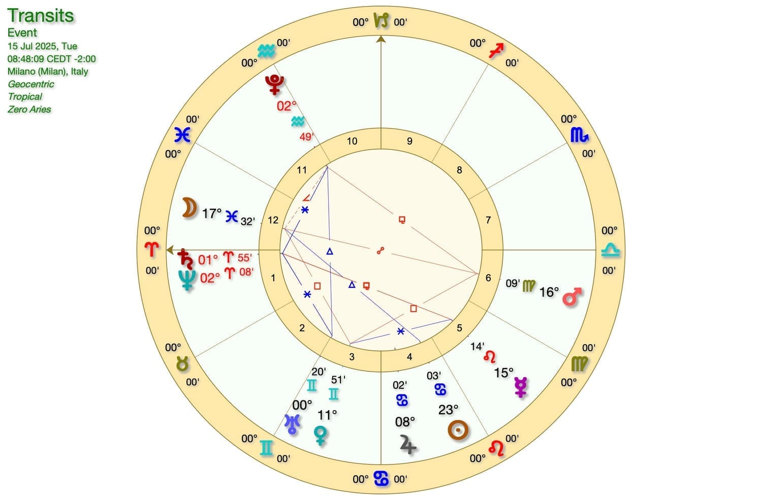 Oggi la LUNA transita in ARIETE sulla CONGIUNZIONE SATURNO-NETTUNO e sarà poi in QUADRATURA a GIOVE in CANCRO.