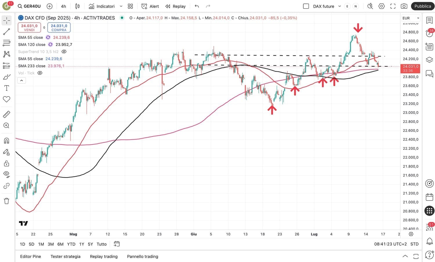 Sul DAX ha tenuto, come già rimarcato, la soglia dei 24000 punti sfiorata l’altra sera, che ha dunque fatto da SUPPORTO.
