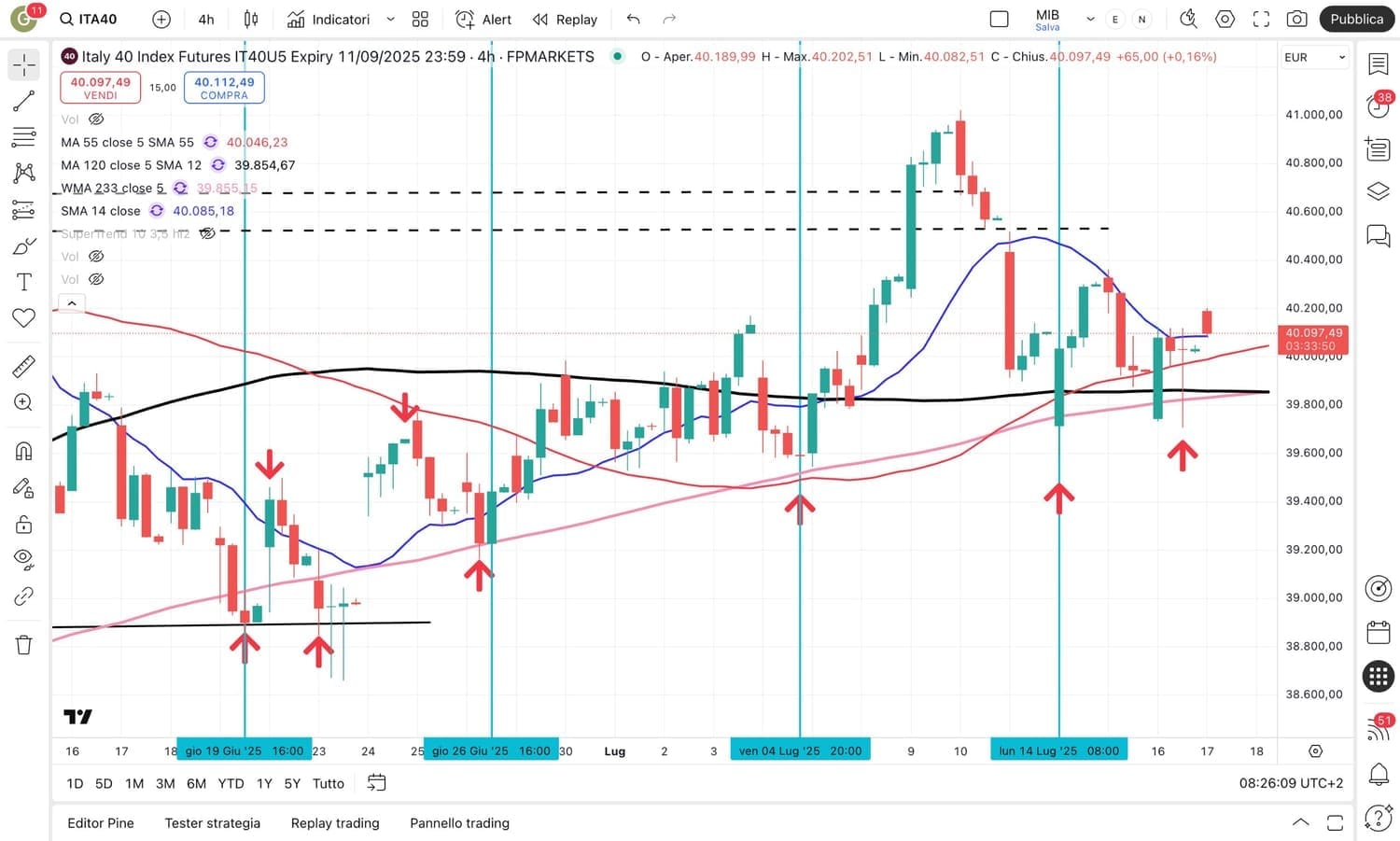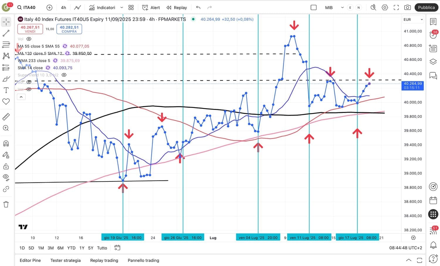 Mentre attualmente siamo sotto i 39800 punti notiamo che questa è zona piuttosto importante perchè corrisponde alla linea della MEDIA MOBILE a 233 periodi colore fucsia, che se bucata con forza potrebbe generare un’accelerazione ribassista.