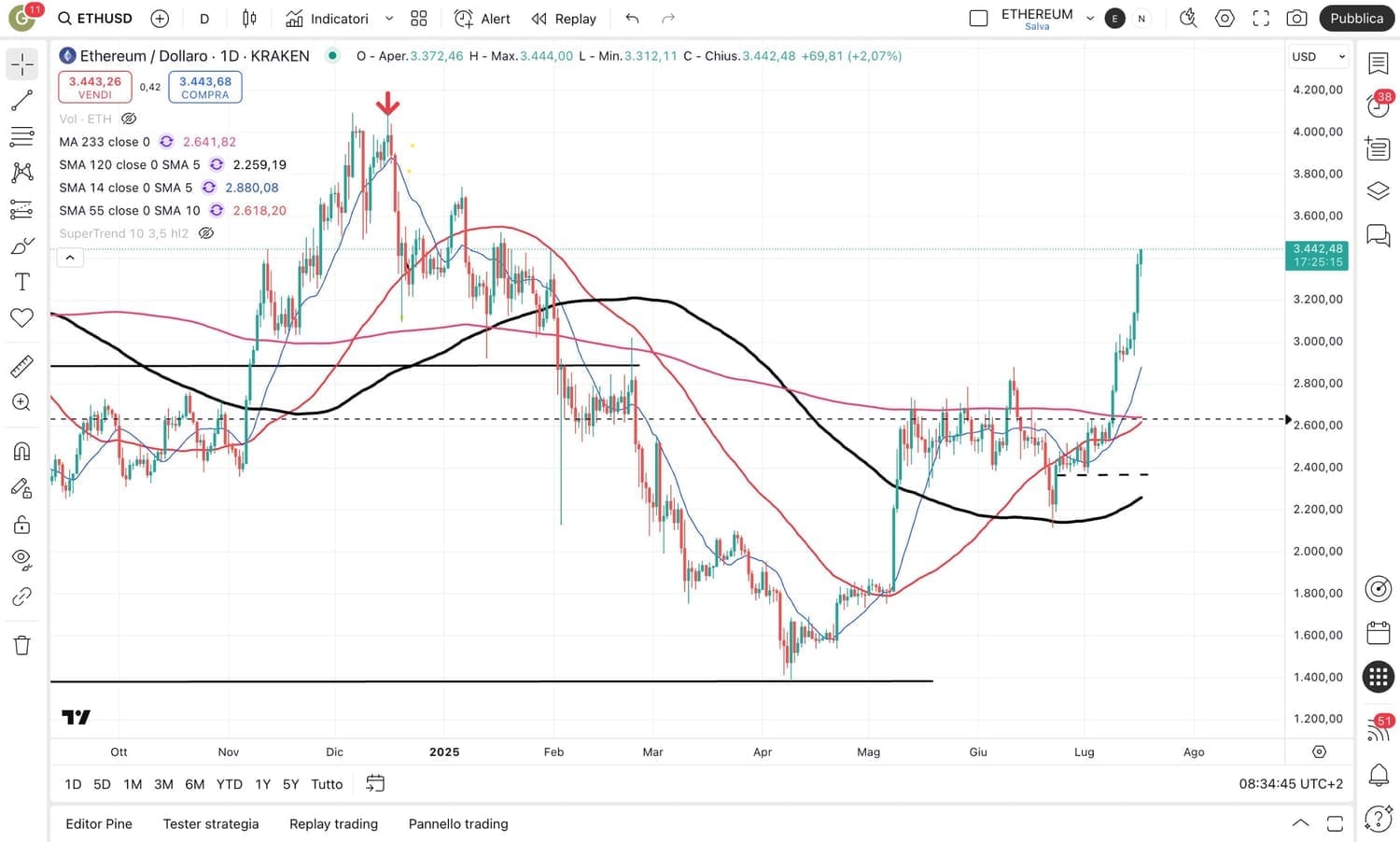 In pratica, mentre BITCOIN si è fermato Lunedì dopo aver raggiunto Lunedì i 123000 dollari, per poi ripiegare dai massimi, ETHEREUM ha fatto partire la “sparata” poco dopo, con forte accelerazione nella giornata di ieri.