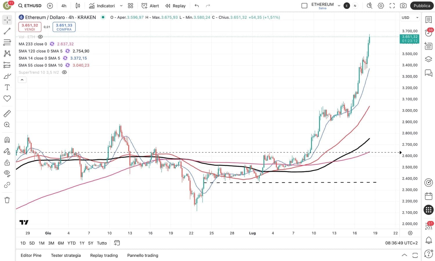 ETHEREUM è letteralmente “esploso” nelle ultime sedute e si trova ora attorno ai 3650 dollari.