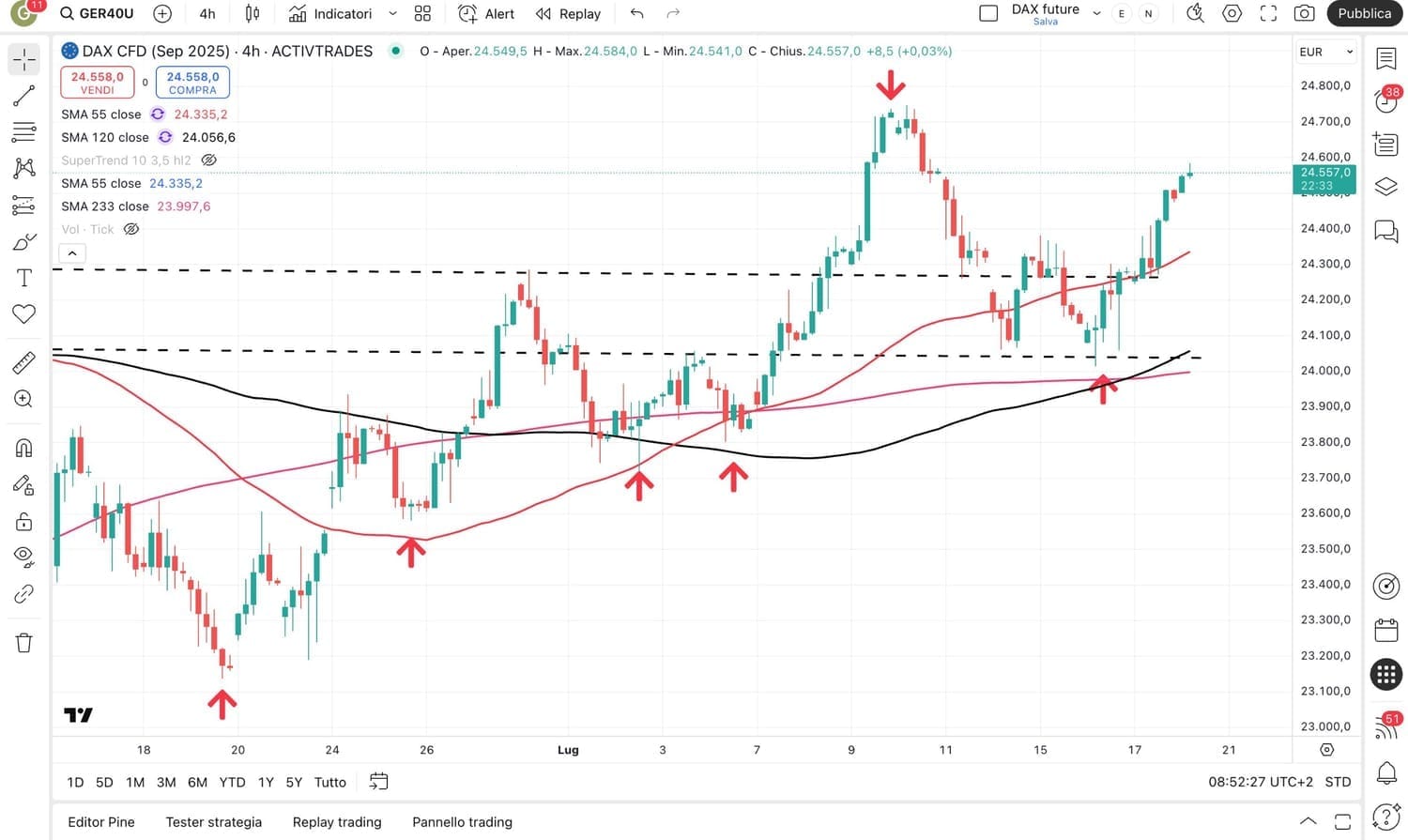 Anche il DAX sta testando delle resistenze di breve (incrocio di medie mobili) e si trova poco sopra i 24300 punti.