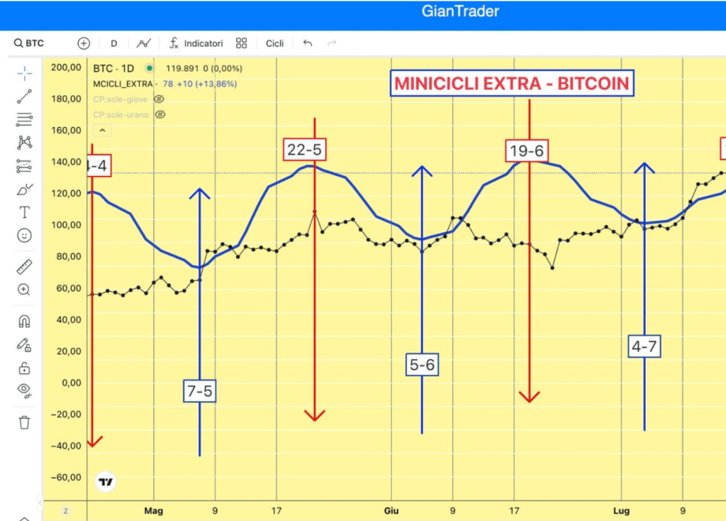 L’ONDA al RIALZO dei MINICICLI si è trovata sincronizzata all’ultimo movimento impulsivo partito proprio attorno al 4 di Luglio, che era il giorno del MINIMO dell’ONDA, percorrendo oltre 15000 dollari, da 107500 a 123000 dollari.