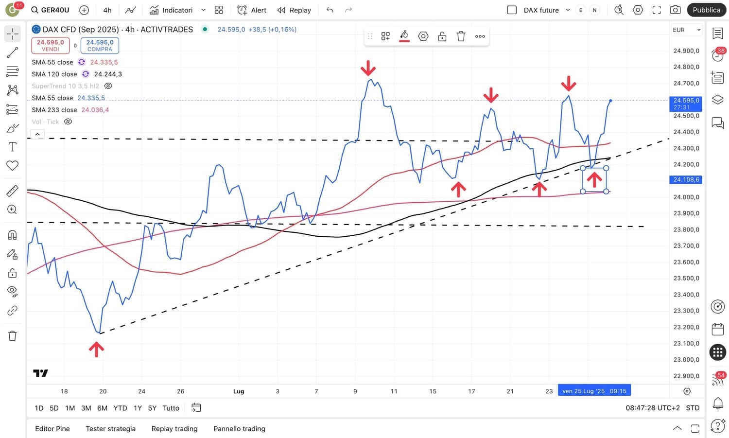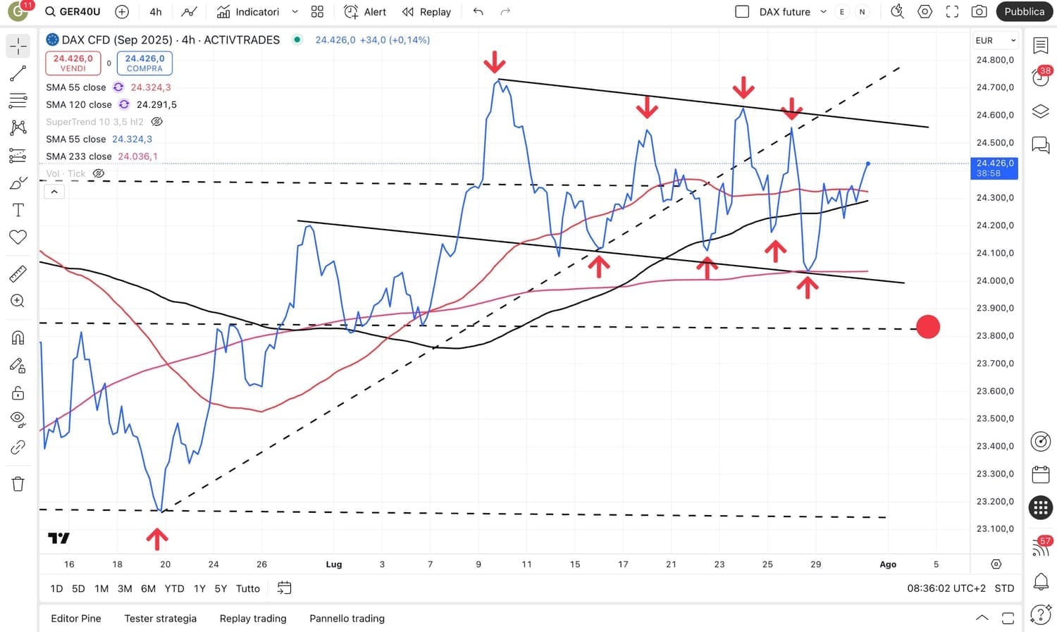 Come già analizzato, solo la netta rottura dei 24000 punti (che potrebbe avvenire anche improvvisamente) potrà innescare un vero e proprio cambio di direzione verso il basso.