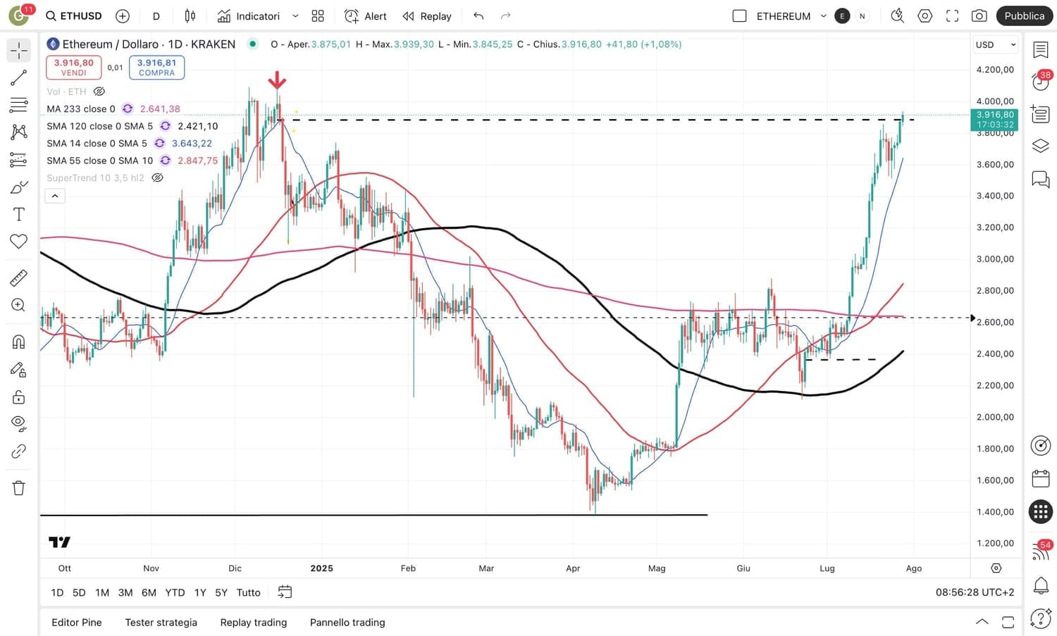 Esaminiamo prima ETHEREUM, che ha superato il massimo precedente del 21 Luglio ed ha sfiorato i 3950 dollari.