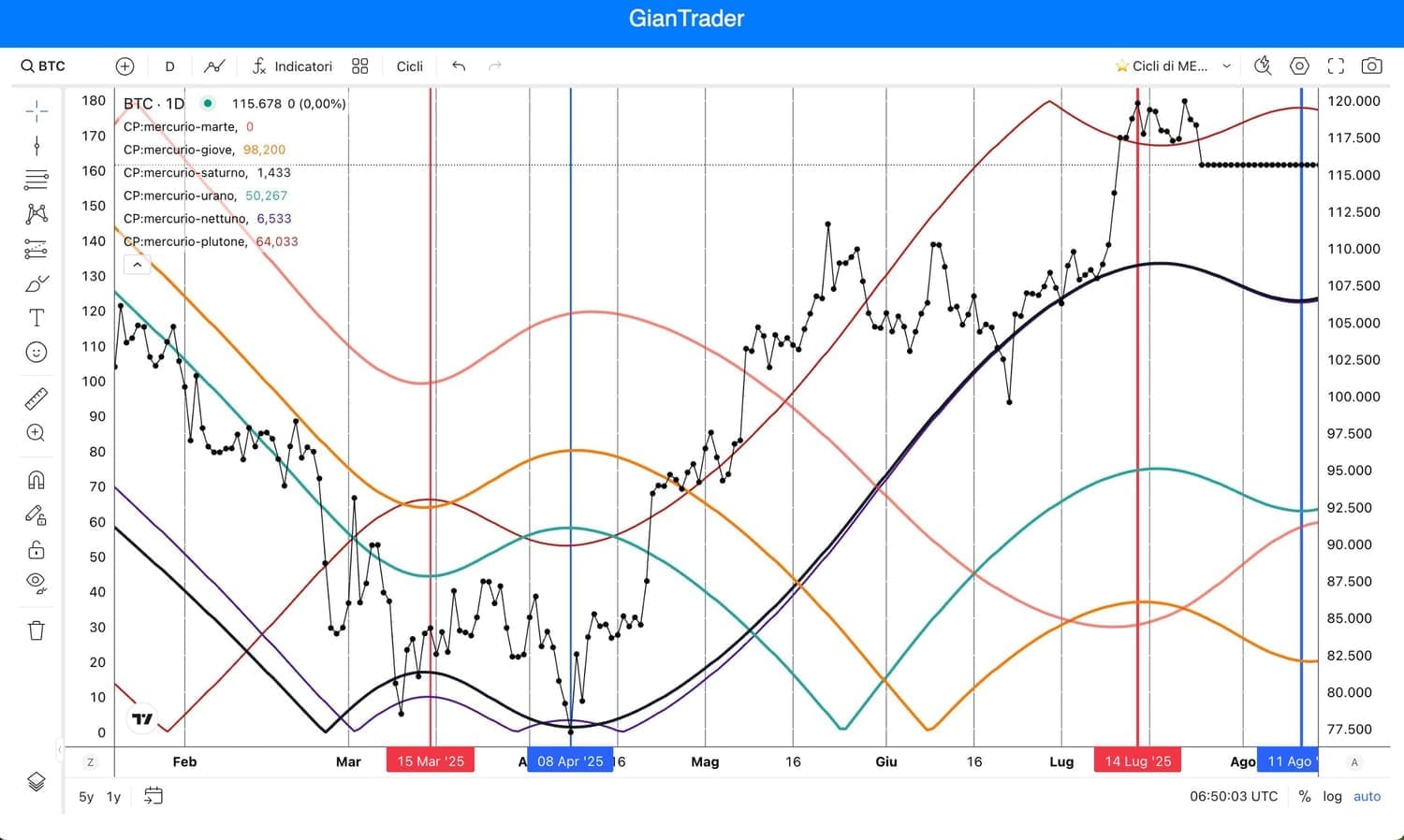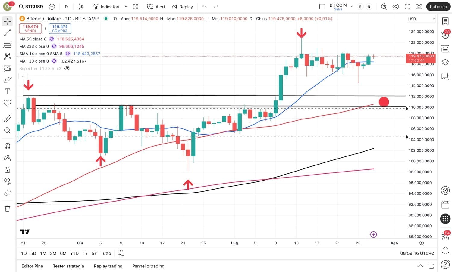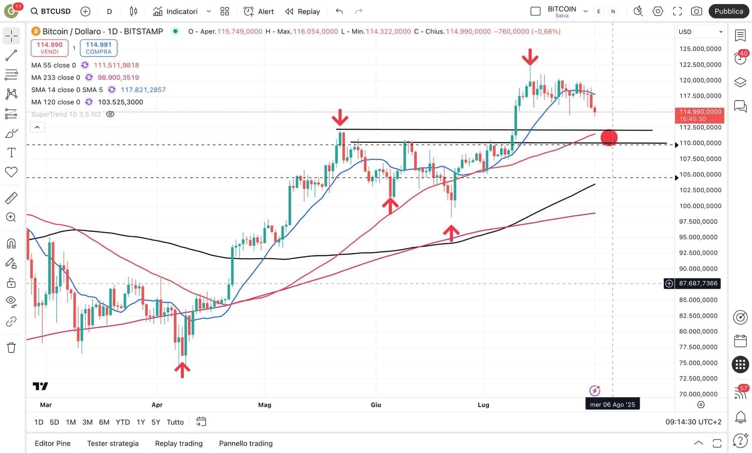 La risalita di BITCOIN, al momento, si è fermata attorno ai 120000 dollari (abbiamo già identificato un possibile punto di atterraggio attorno ai 110000-112000 dollari).