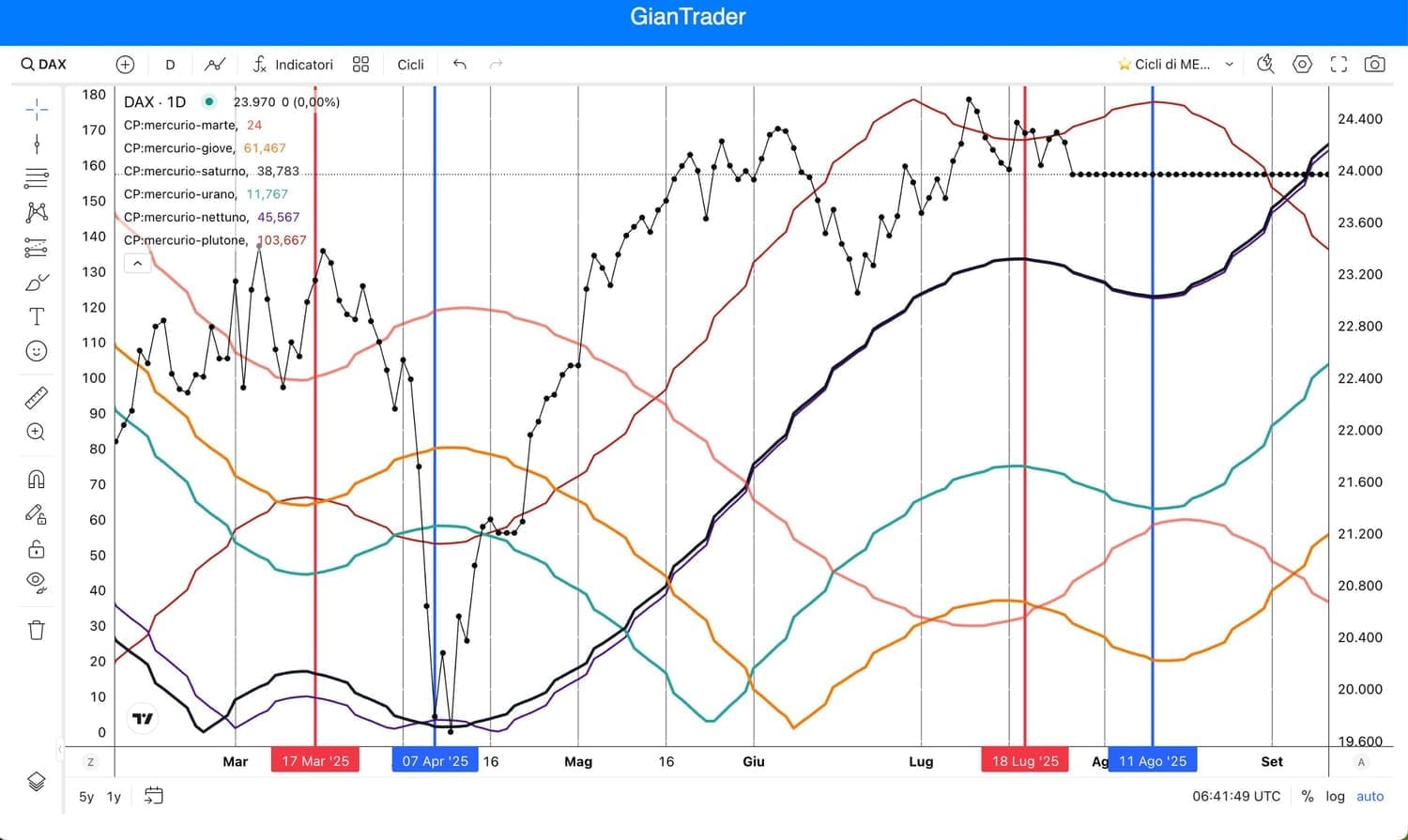 Sta di fatto che quando è iniziata la RETROGRADAZIONE di MERCURIO il 15 di MARZO (linea rossa verticale) eravamo in una fase laterale-rialzista come quella attuale e dopo alcuni giorni la tendenza è diventata fortemente ribassista fino al 7-8 di Aprile, proprio sulla ripresa del MOTO DIRETTO di MERCURIO (linea blu verticale).