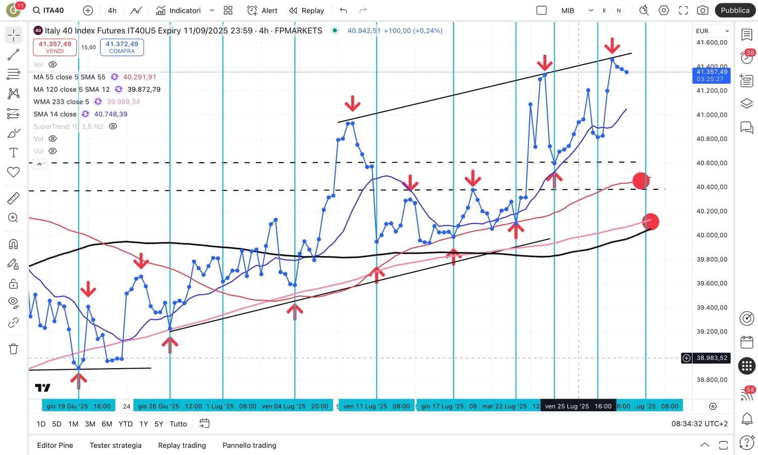 In pratica, mentre il DAX si trova sopra di circa 400 punti rispetto al SUPPORTO della MEDIA MOBILE a 233 già esaminata (che passa attorno ai 24000 punti), il MIB è sopra di circa 1800 punti rispetto alla stessa MEDIA MOBILE a 233, che passa attorno ai 40150 punti….