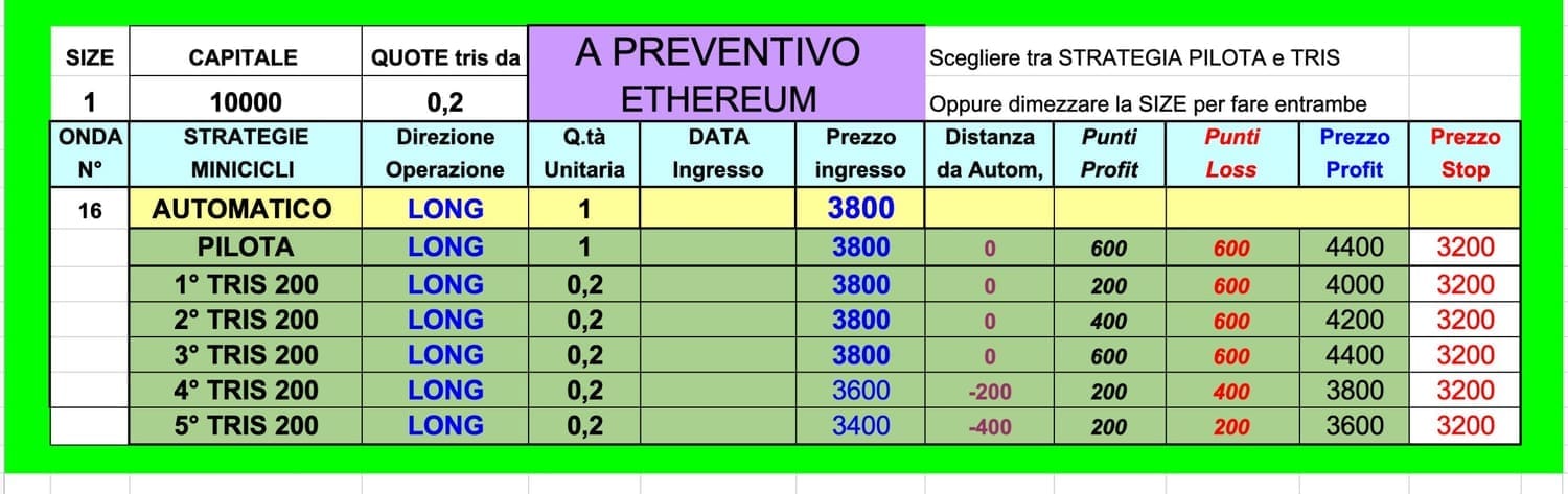 Qui sotto vi mostro la TABELLA qualora si fosse effettivamente effettuata l’inversione al RIALZO il 30 Luglio, quando il prezzo di ETHEREUM era attorno ai 3750-3800 dollari….