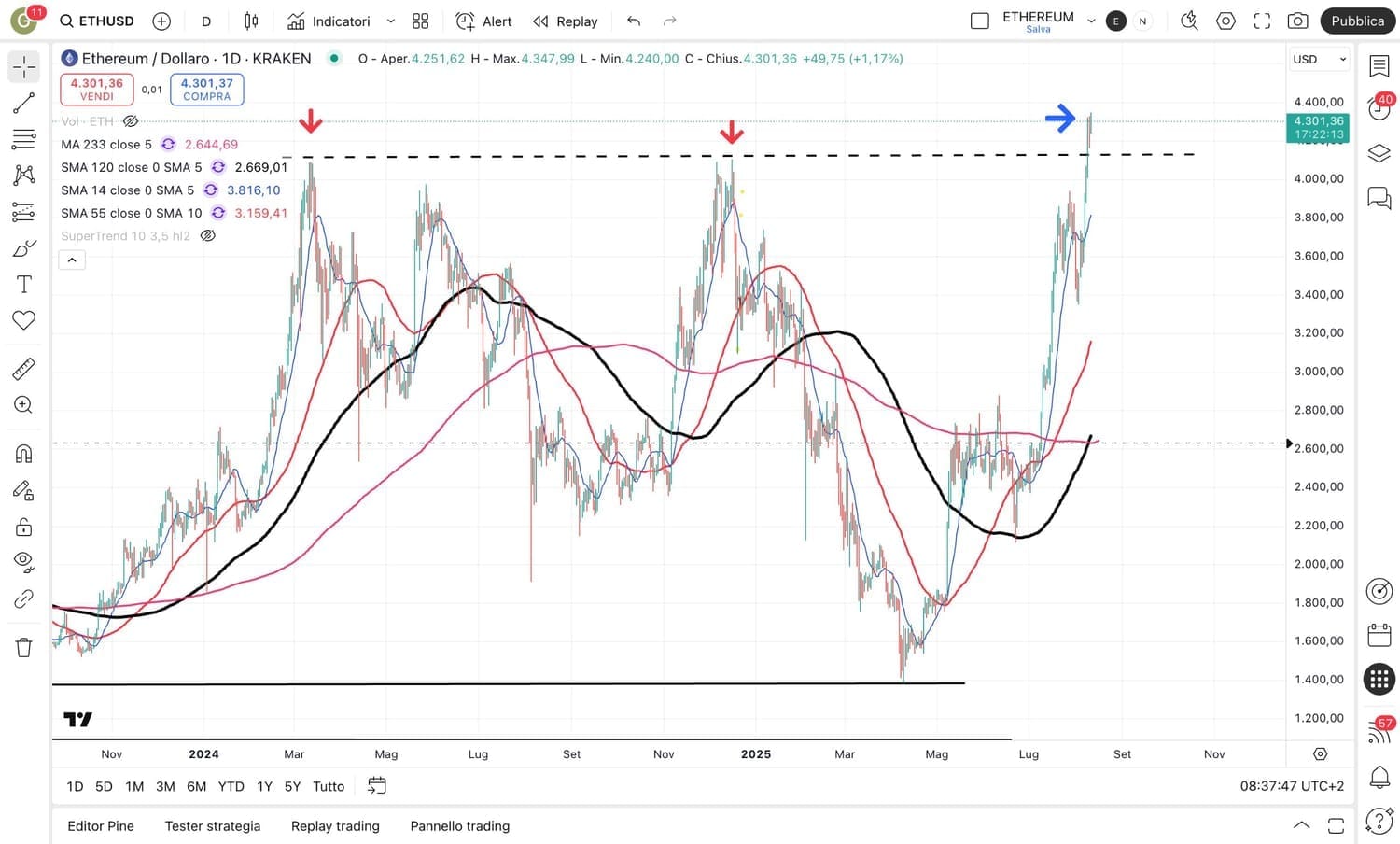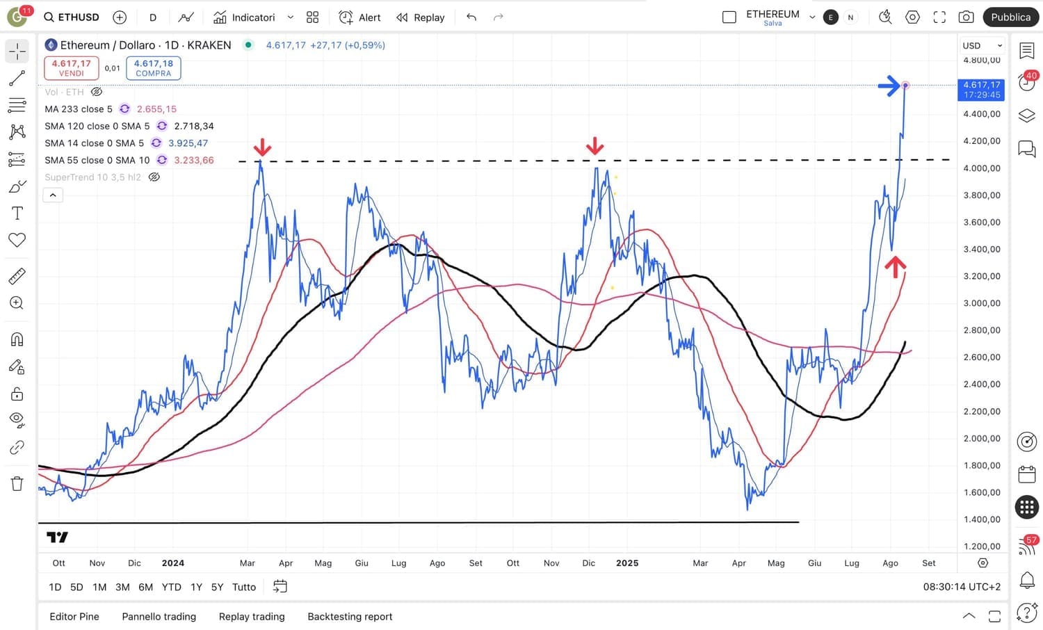 L’ONDA al RIALZO dei MINICICLI si sta dimostrando fortemente correlata a ETHEREUM, che ha superato i massimi assoluti e si trova ora attorno ai 4300 dollari.