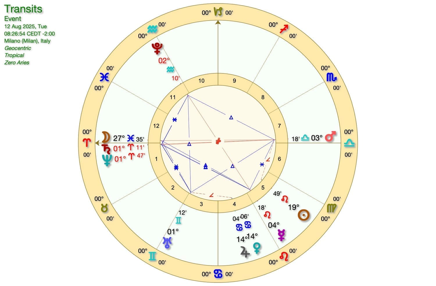 Oggi la LUNA si trova alla fine dei PESCI ed entrerà in mattinata in ARIETE, in CONGIUNZIONE a SATURNO e NETTUNO, in SESTILE a URANO in GEMELLI e in OPPOSIZIONE a MARTE in BILANCIA.