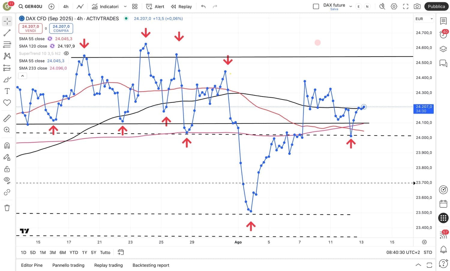 Il DAX ha fatto un massimo il 9 Luglio ed è rimasto prevalentemente laterale nell’ultimo mese a cavallo dei 24000 punti, pur con alcune ampie oscillazioni (ora ne siamo al di sopra).