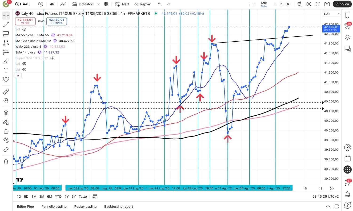 Osserviamo questo eccezionale movimento partito dai 39900 punti di Venerdì 1 Agosto dalla MEDIA MOBILE a 233 periodi, che poteva essere intercettato, come analizzato, Lunedì 4 Agosto a 40200-40300 punti.