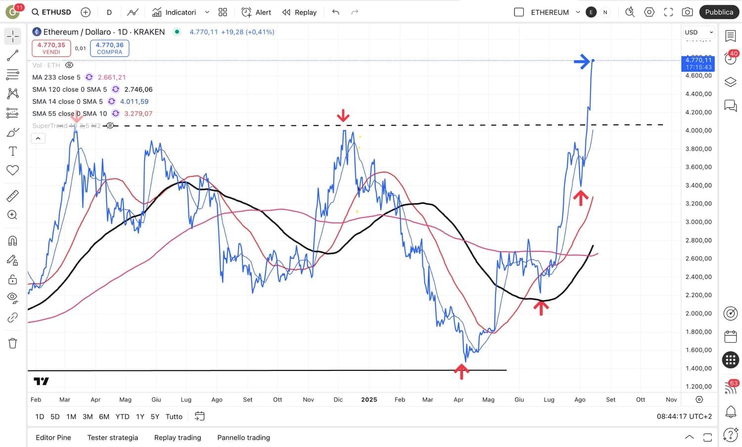 Veramente potente la salita di ETHEREUM che ha appena sfiorato i 4800 dollari e che dal MINIMO di Domenica 3 Agosto attorno ai 3400 dollari ha messo a segno un rialzo di ben 1200 dollari in 11 giorni.