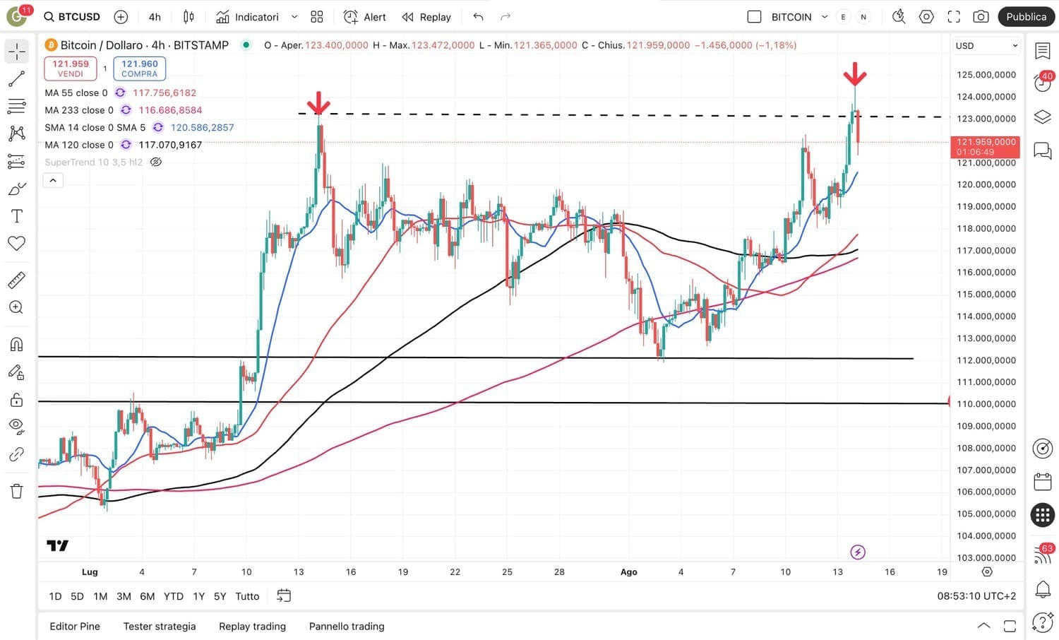 Premesso che il dato “in automatico” di inversione sarà quello della chiusura di stasera 14 Agosto, per chi avesse effettuato la pre-inversione con DUE QUOTE di BITCOIN da 119800, sarebbe poi scattato l’ingresso della TERZA QUOTA SHORT a 122800 dollari.