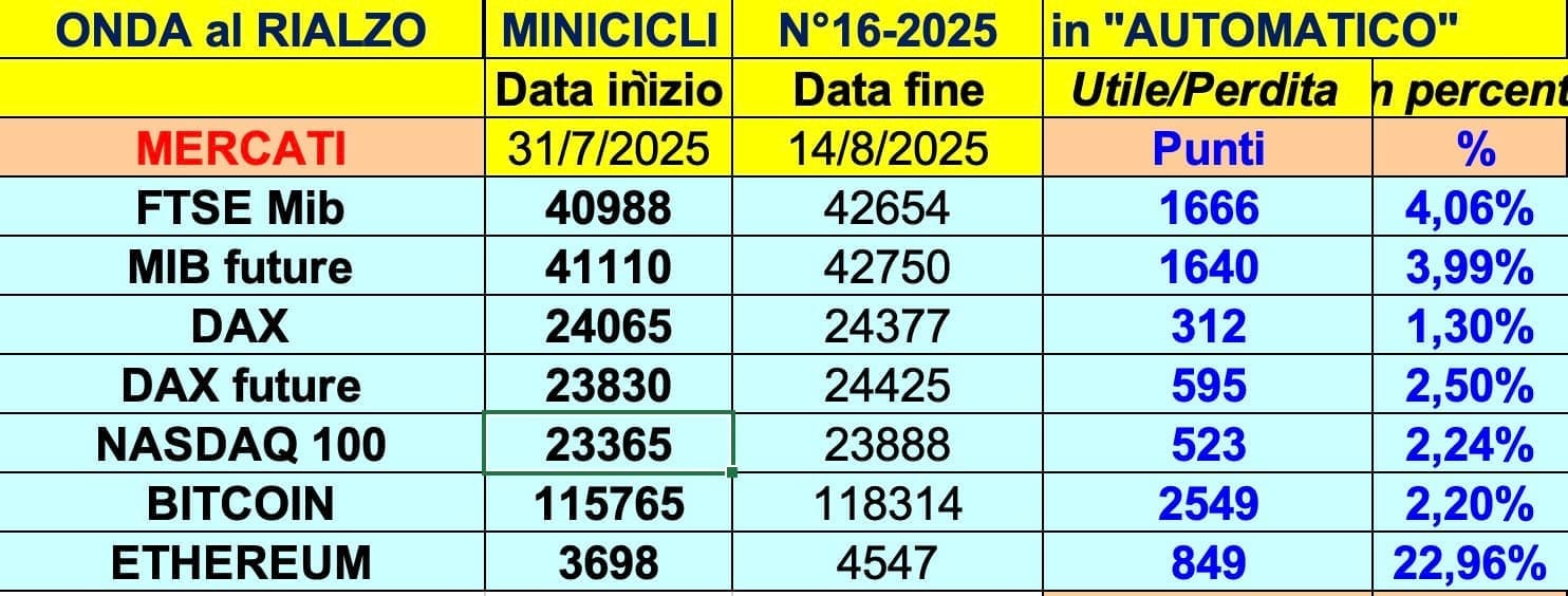 Partiamo innanzitutto dall’ONDA al RIALZO dei MINICICLI che terminava ieri 14 Agosto.