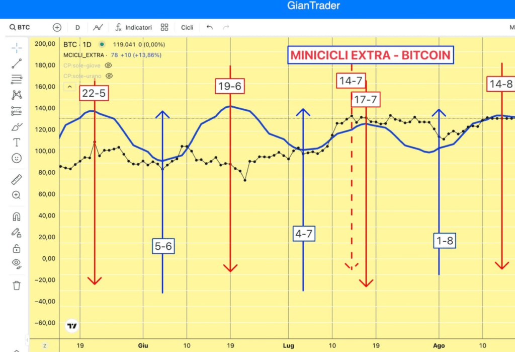 Nel grafico MINICICLI – BITCOIN qui sopra potete già osservare il termine dell’attuale ONDA al RIALZO (14-8) e la successiva ONDA al RIBASSO fino al … (la DATA è conosciuta in anticipo dagli ABBONATI).