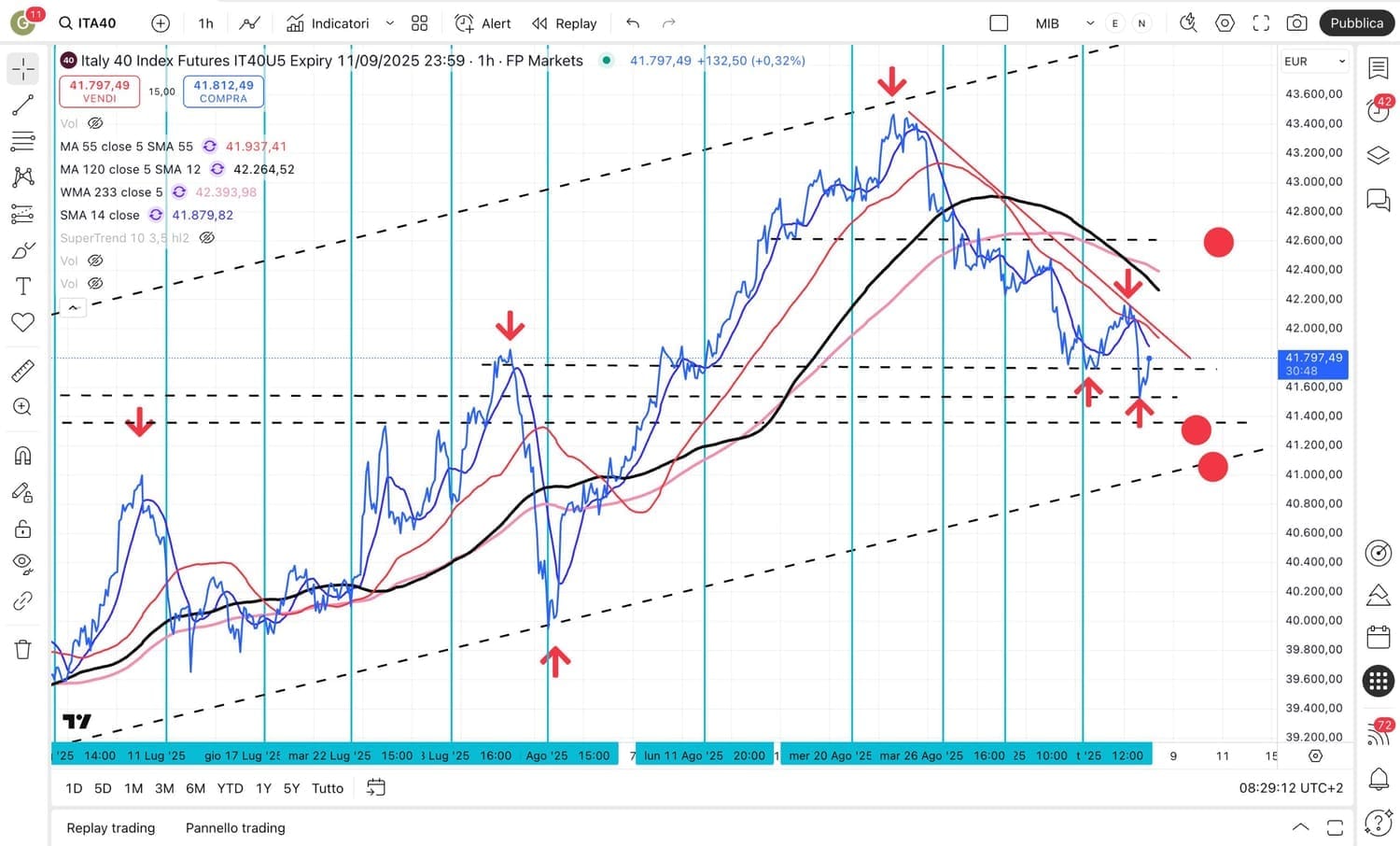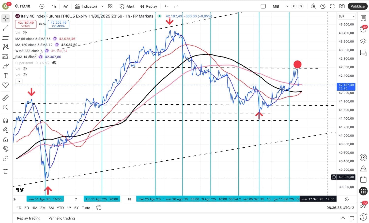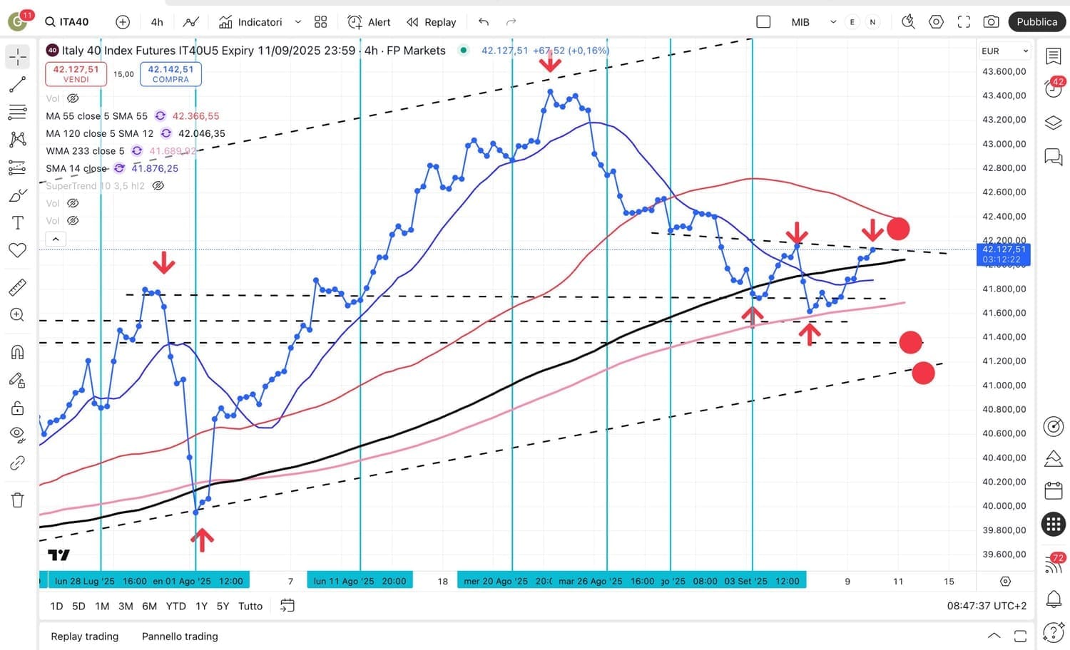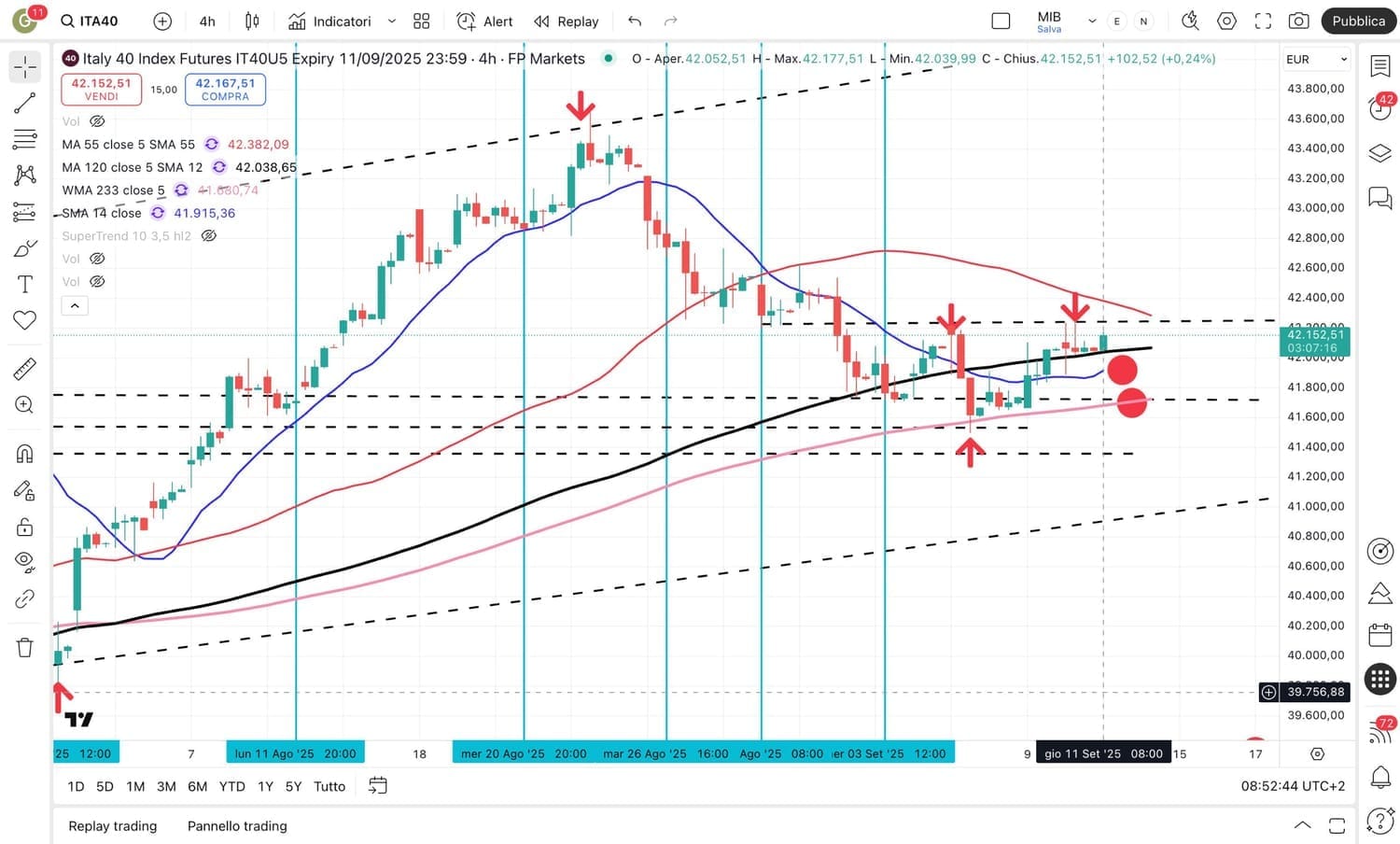 Martedì scorso (2 Settembre) il MIB era arrivato sul supporto attorno ai 41700-41800 punti ed aveva rimbalzato raggiungendo il primo obiettivo al rialzo attorno ai 42200 punti, così come avevamo ipotizzato.