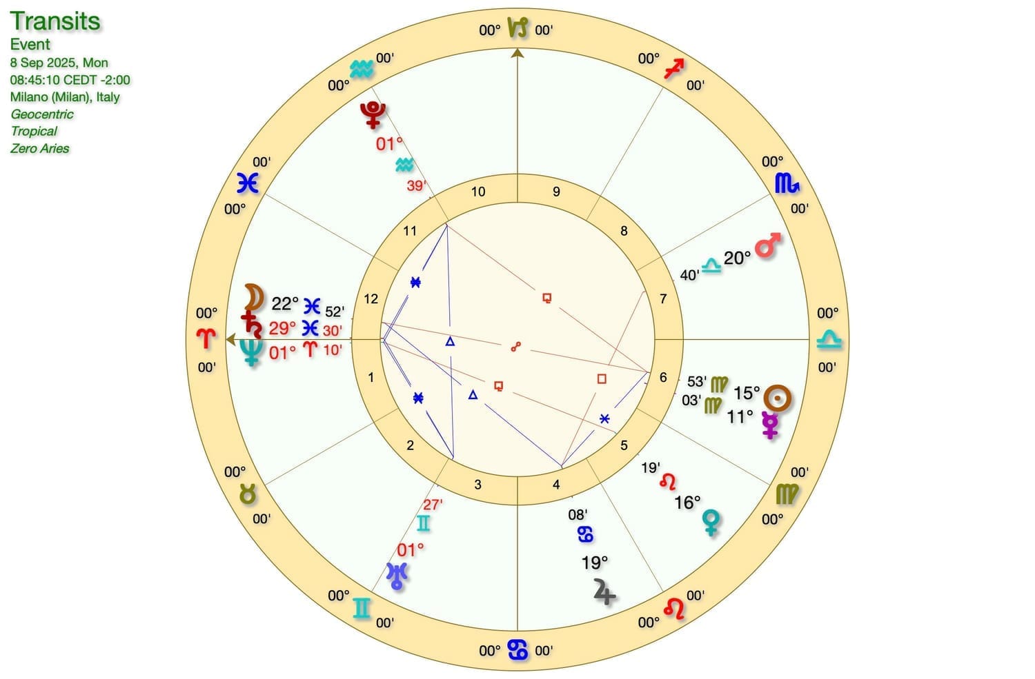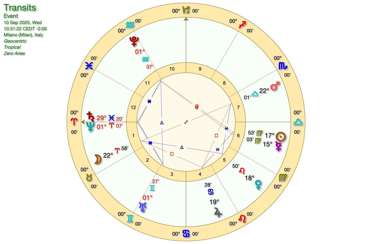 La LUNA in PESCI si sta avvicinando alla CONGIUNZIONE con SATURNO e NETTUNO e domani mattina sarà in ARIETE, in SESTILE a URANO e PLUTONE in TRIGONO tra loro.