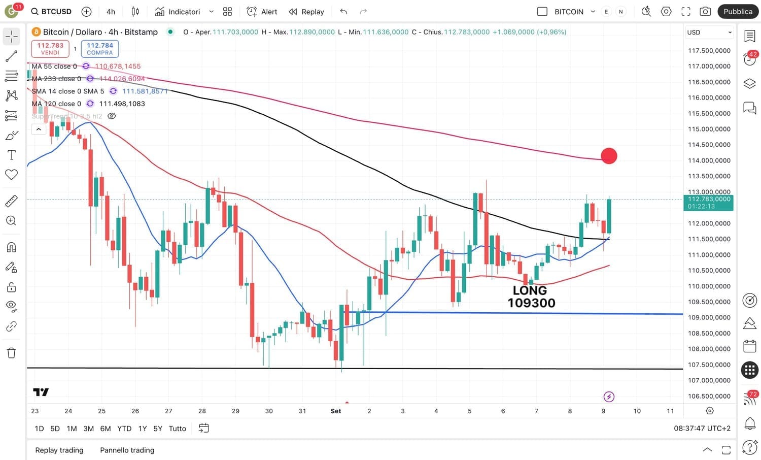 Dai 109300 dollari dell’ingresso il prezzo è salito fino agli attuali 113000 dollari circa, con un potenziale obiettivo di breve attorno ai 114000 dollari.