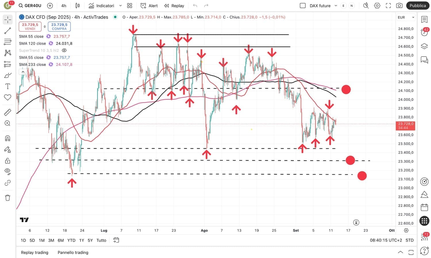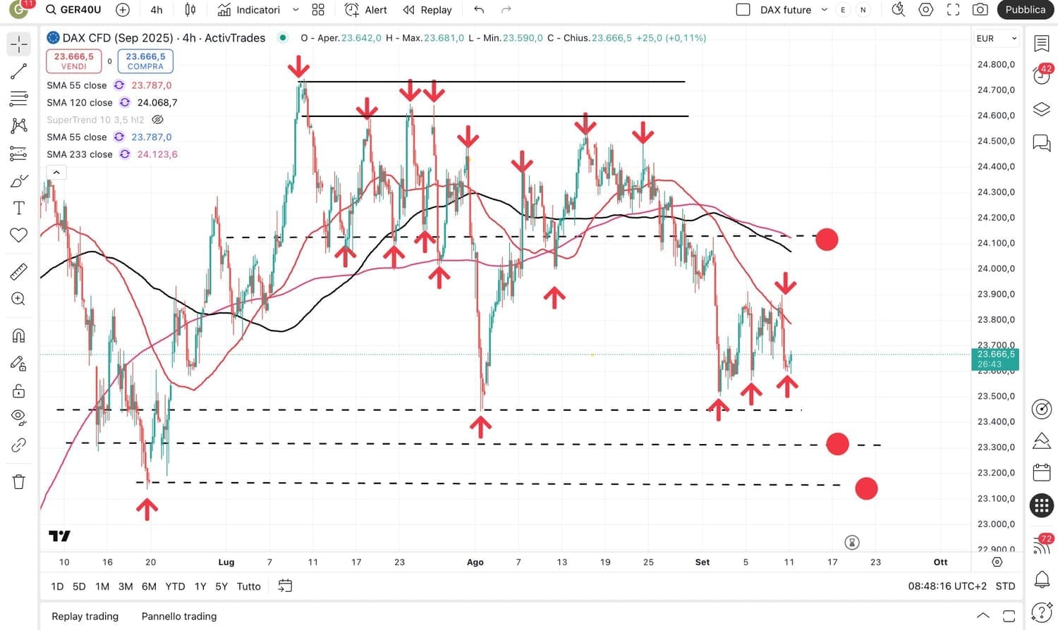 Il DAX ha trovato dunque una zona di SUPPORTO tra i 23500 e i 23600 punti, vale a dire sui MINIMI di questo mese di Settembre.