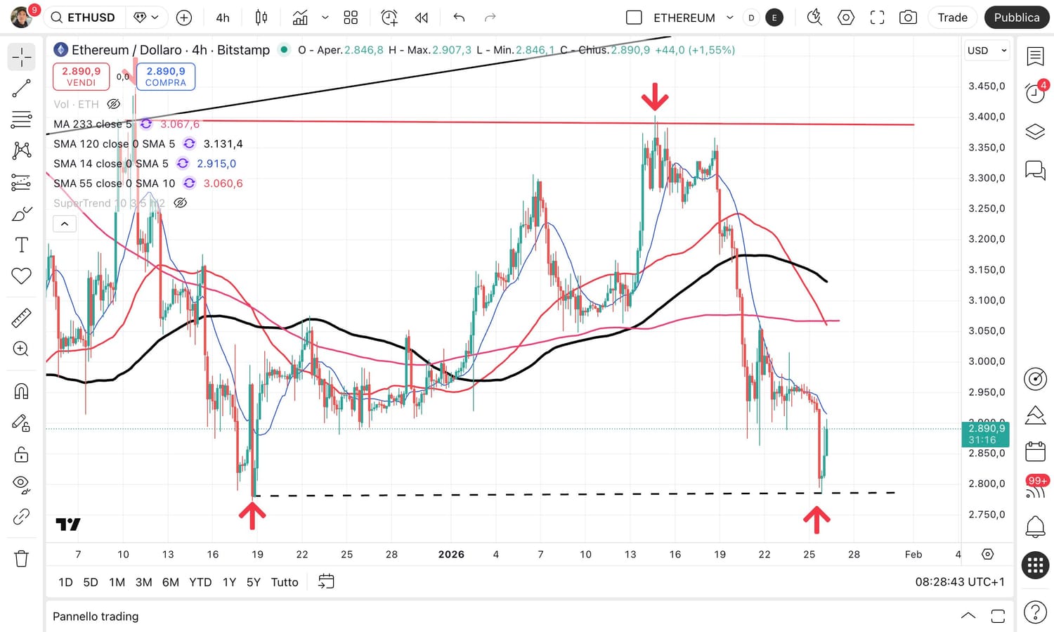 ETHEREUM ieri sera ha fatto anch’esso un potenziale doppio minimo ma con i prezzi di metà Dicembre, poco sotto i 2800 punti.
