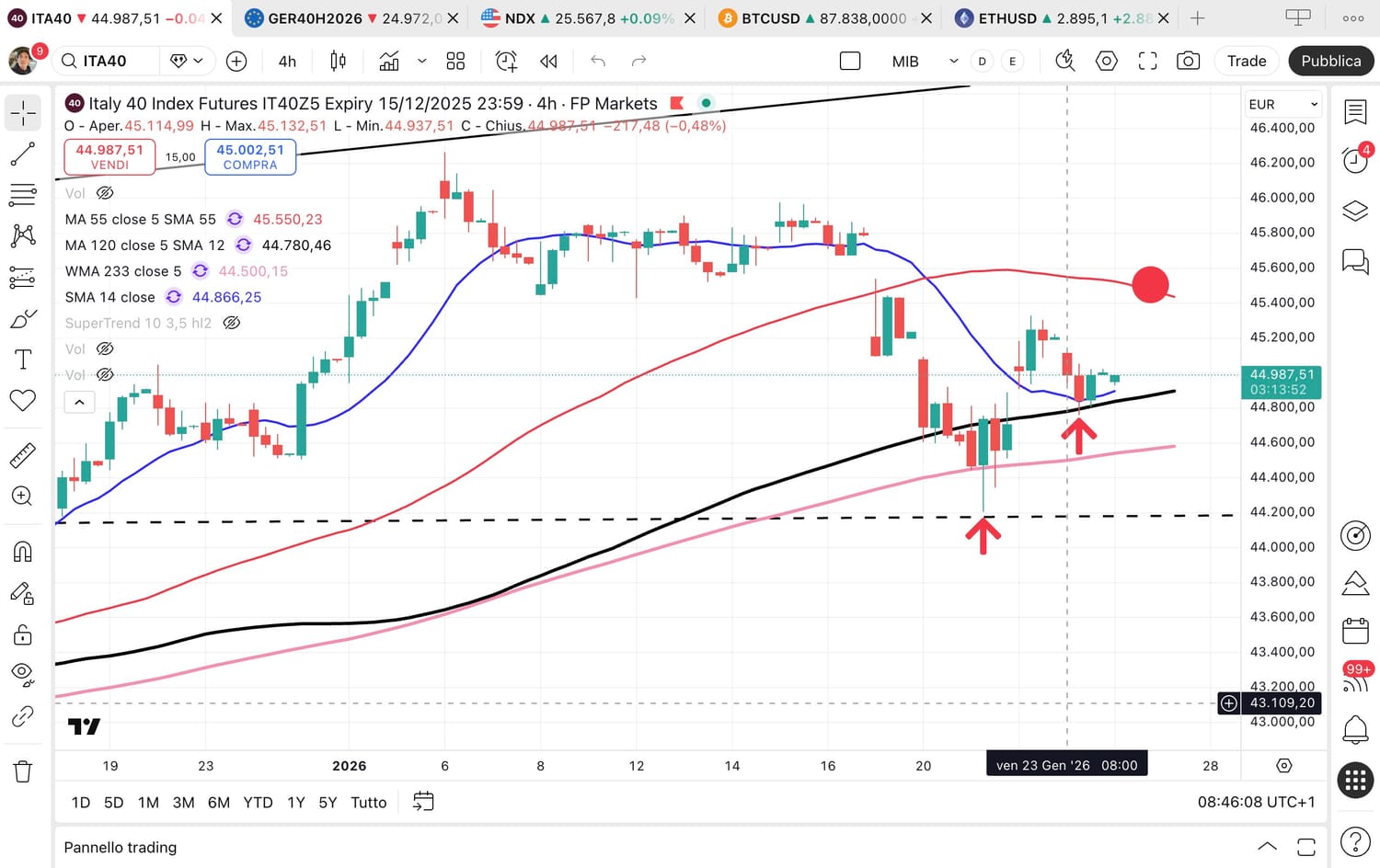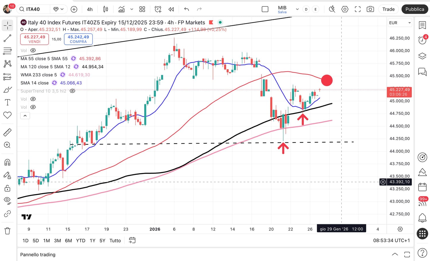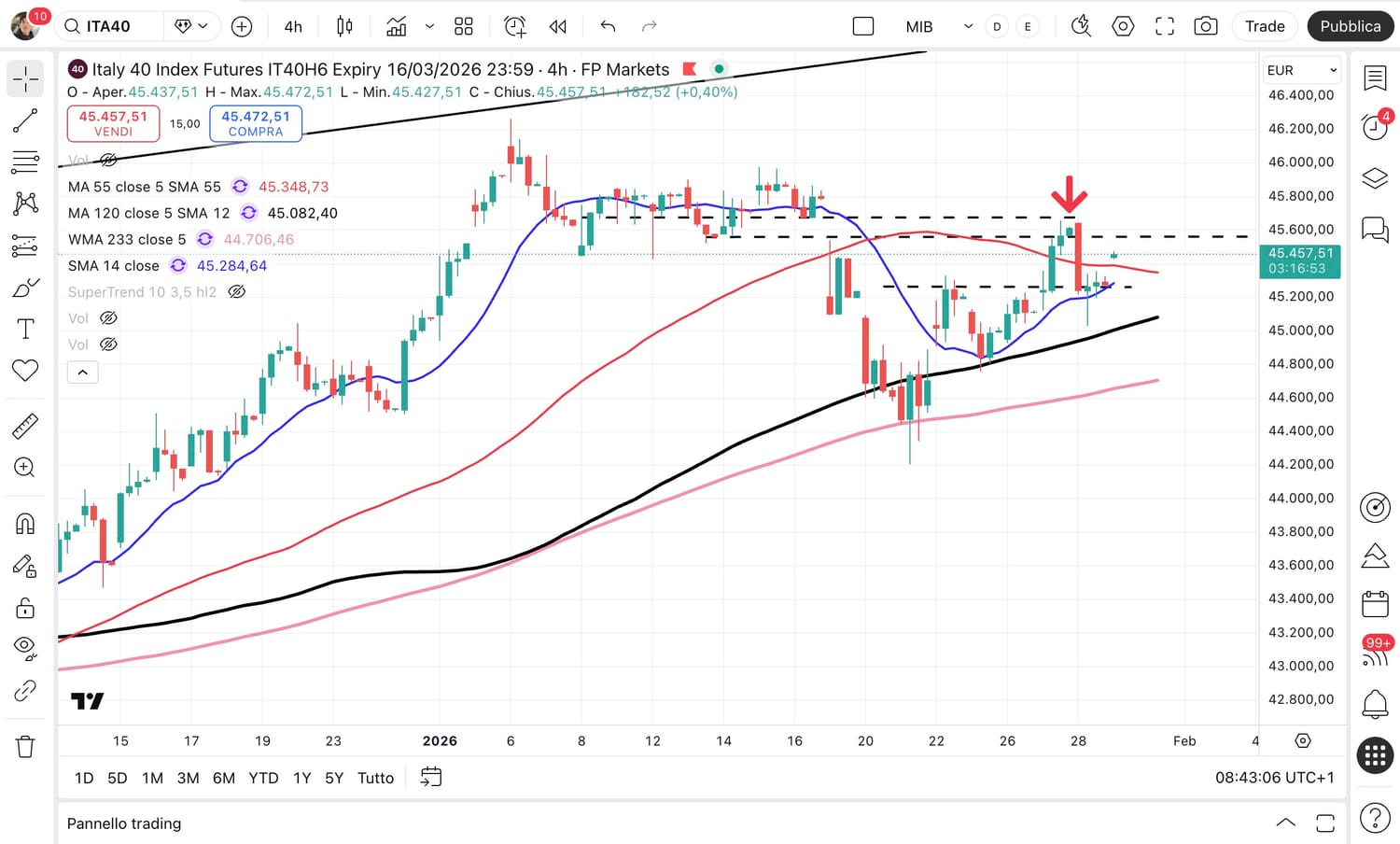 Il MIB sta andando a chiudendo il GAP aperto lunedì 19 Gennaio, per cui si è valutato un REINGRESSO SHORT (al momento dell’aggiornamento il prezzo si aggirava attorno ai 45500 punti.