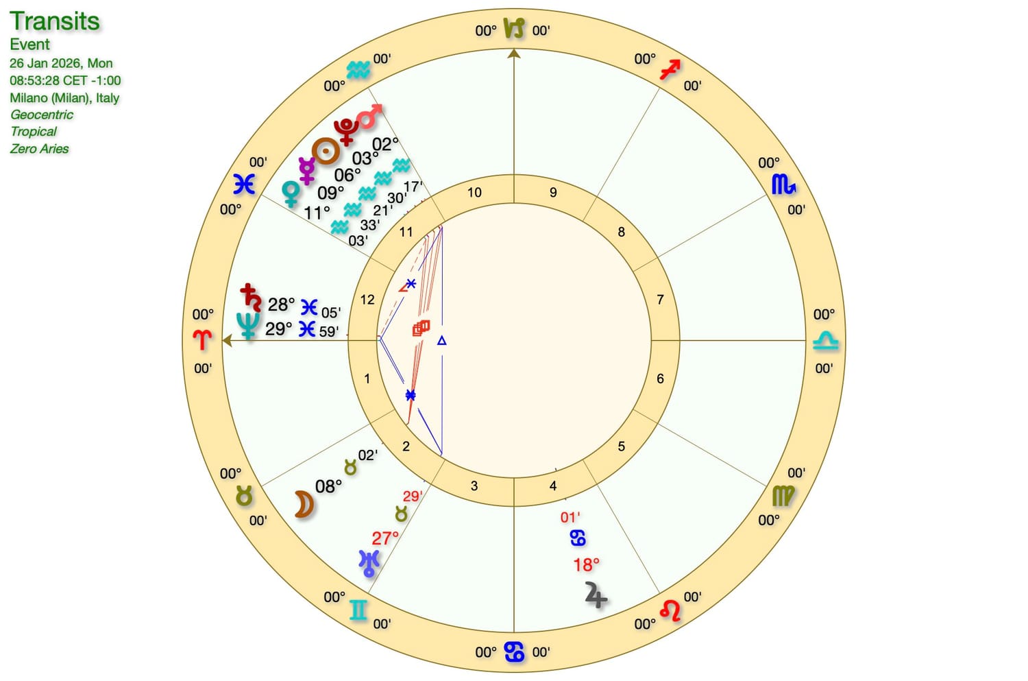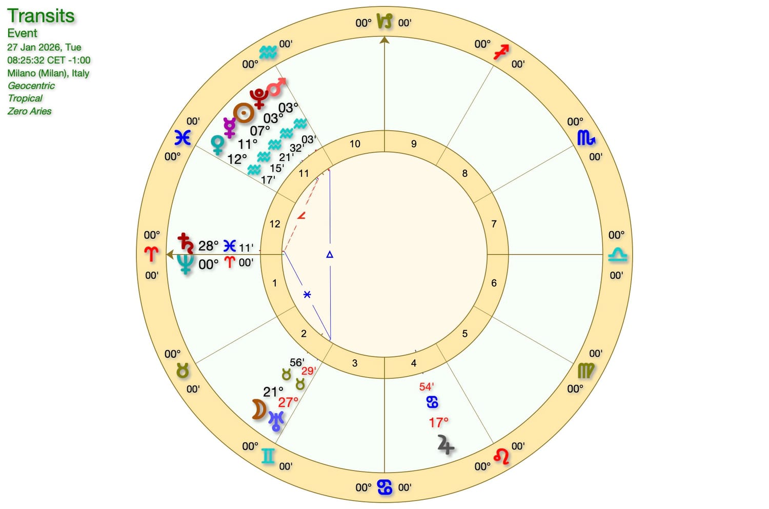 A livello planetario ci troviamo in un punto cruciale, con lo STELLIUM di PIANETI in ACQUARIO e la LUNA che transita oggi in TORO, in quadratura allo STELLIUM.