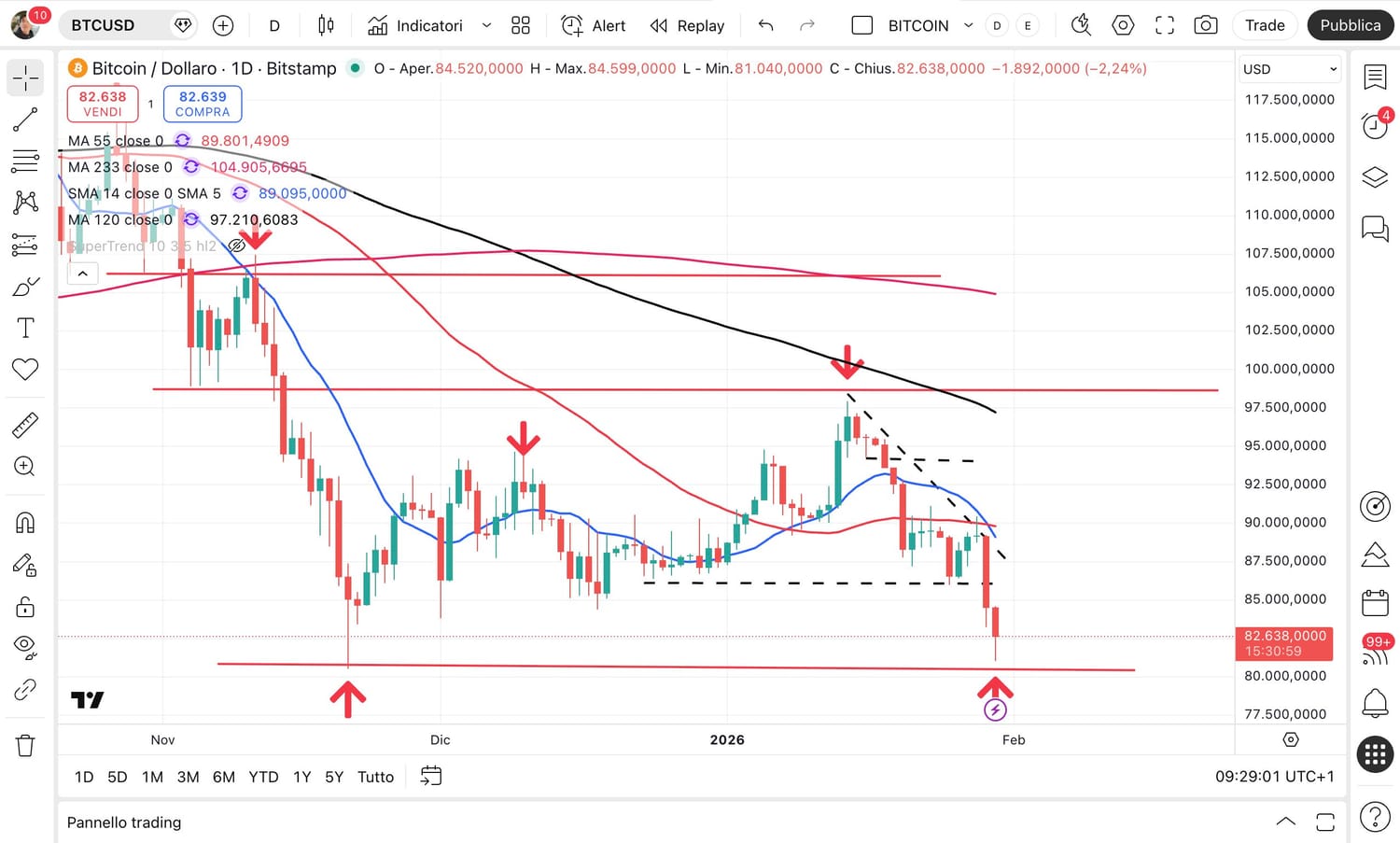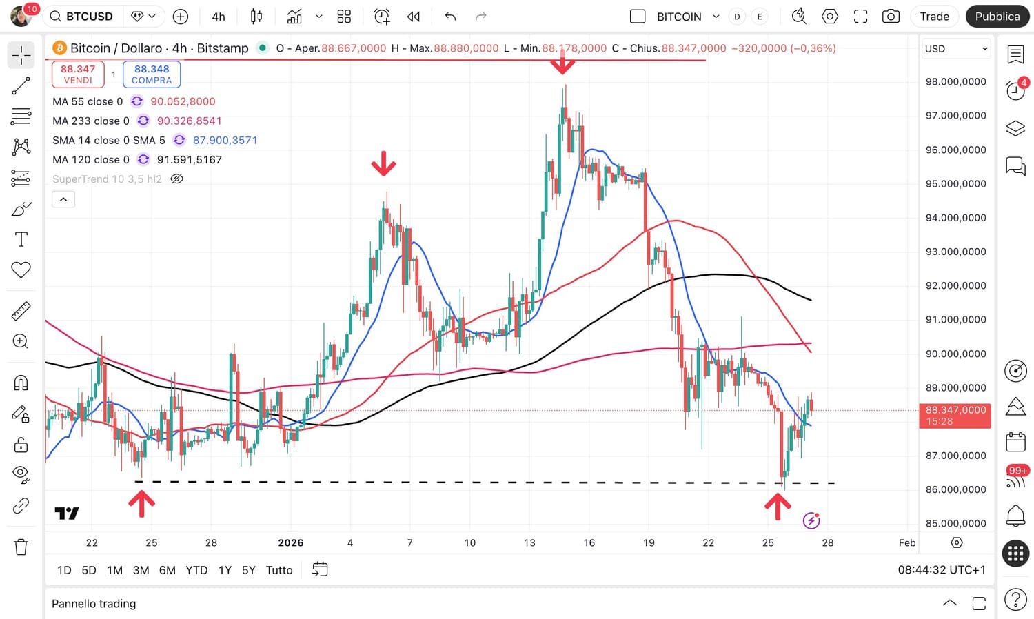 Nella serata di ieri BITCOIN era sceso fino agli 86500 dollari circa, formando un potenziale doppio minimo con quello di fine Dicembre (a un mese esatto di distanza).