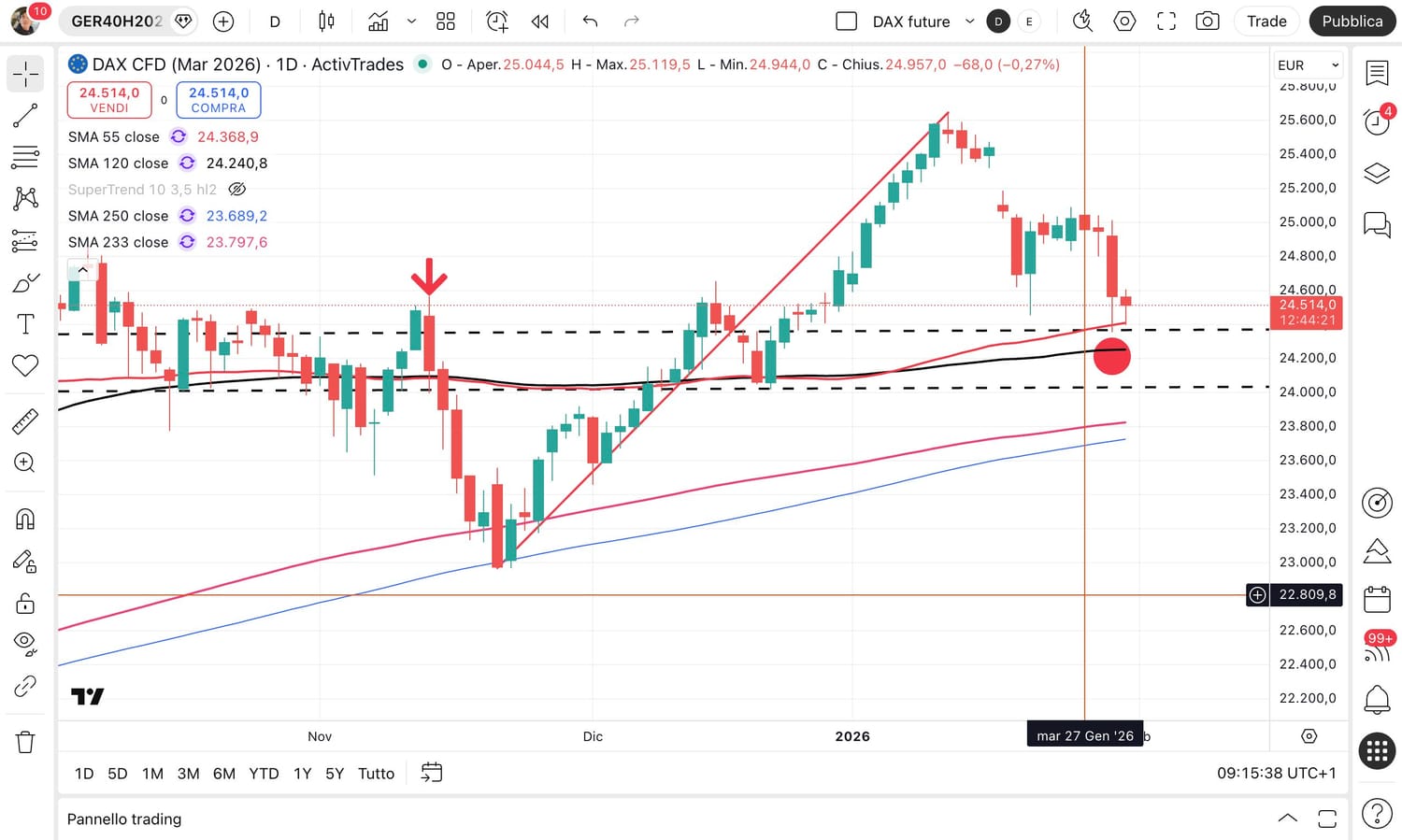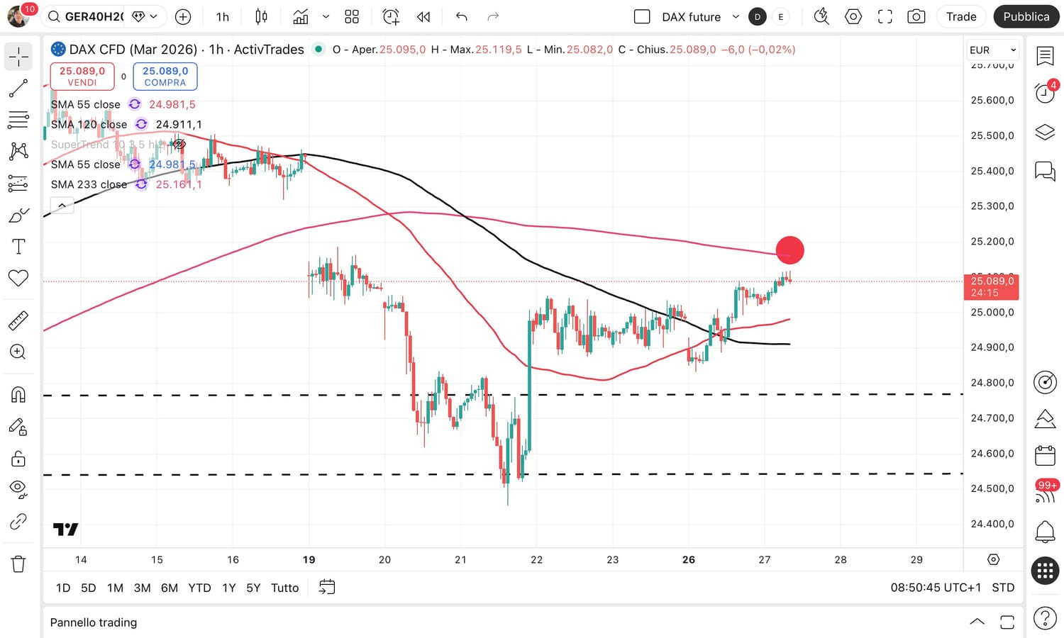Il DAX aveva fatto un MASSIMO attorno ai 25800 e un MINIMO poco sopra i 24400, mentre ora il prezzo oscilla attorno ai 25100 punti circa.