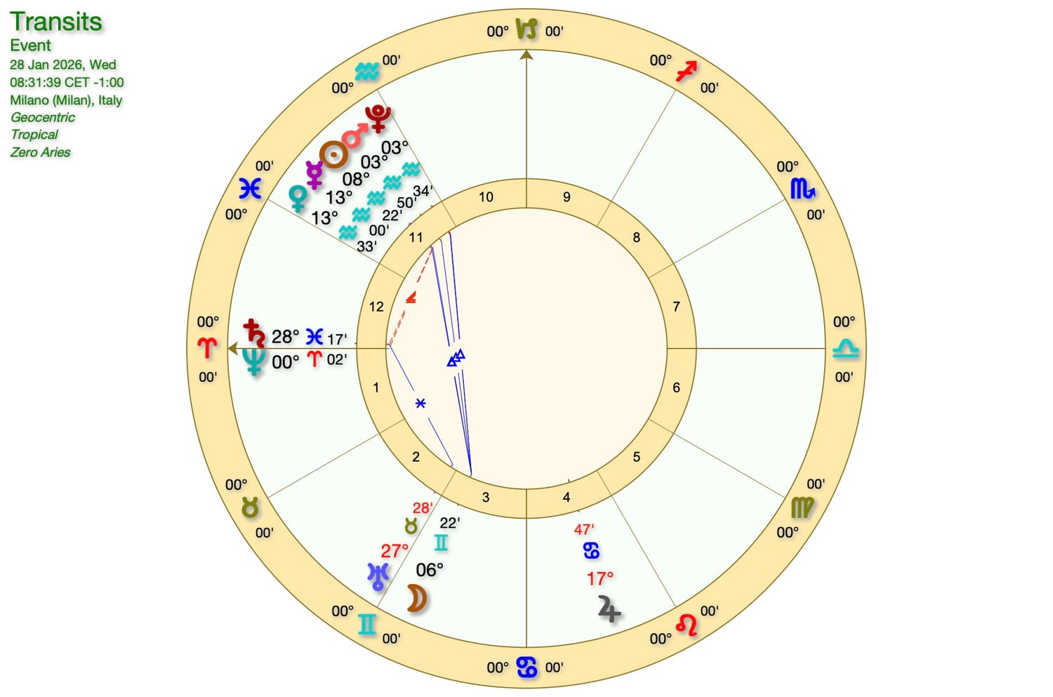Oggi abbiamo un aspetto molto potente di TRIGONO tra la LUNA in GEMELLI e lo STELLIUM di pianeti in ACQUARIO.