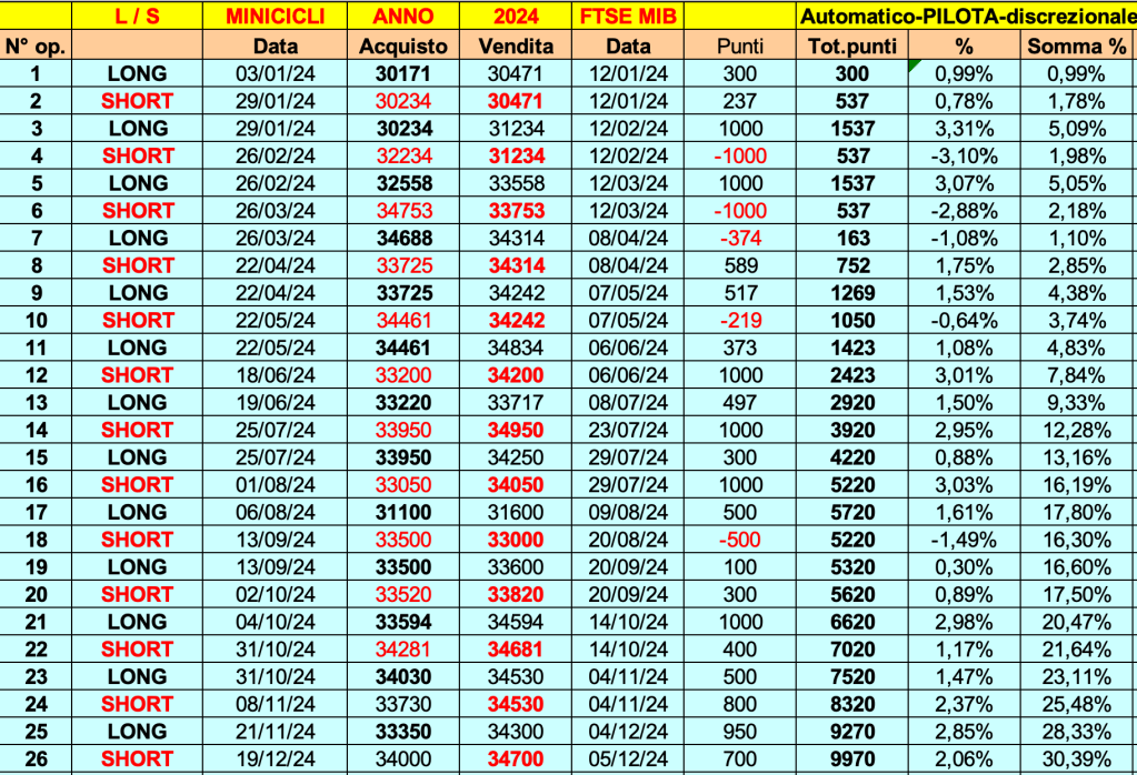 Sotto i RISULTATI MINICICLI nel 2024 su cinque mercati: FTSE MIB, DAX, NASDAQ 100, BITCOIN, ETHEREUM.