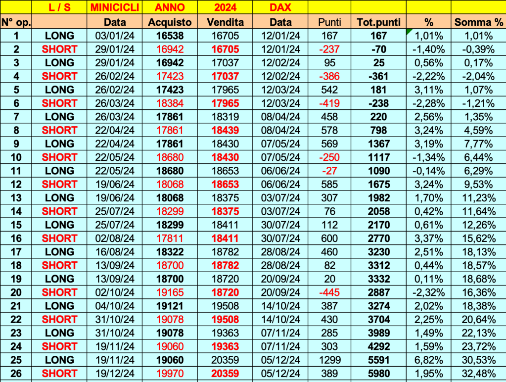 Riepilogo statitistco DAX: 26 ONDE, +5980 punti, +32%, 20 onde positive e 6 negative